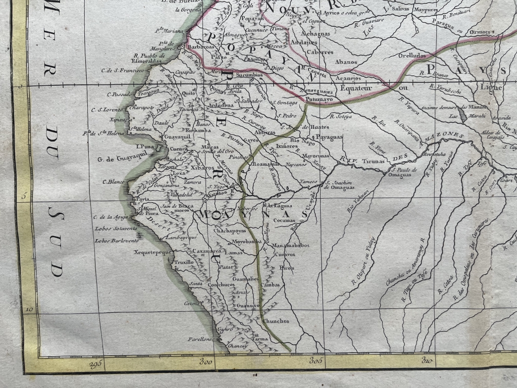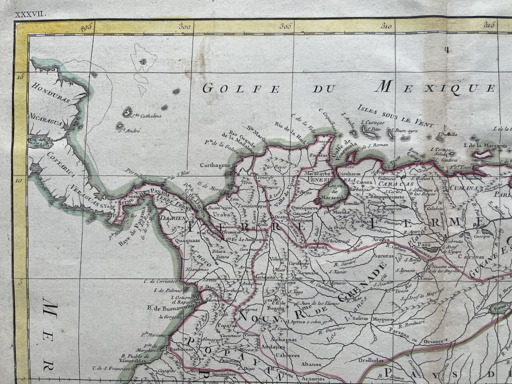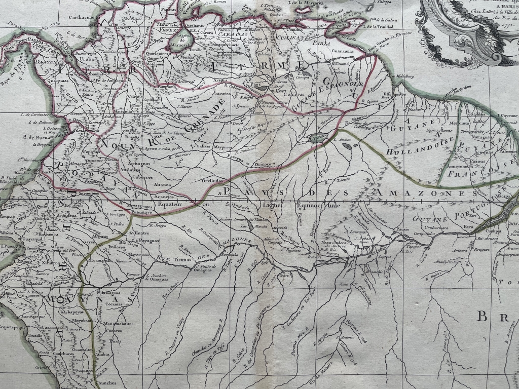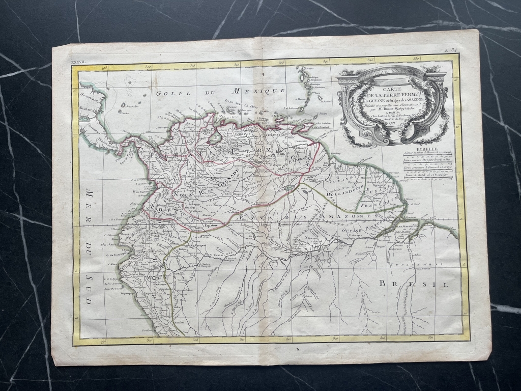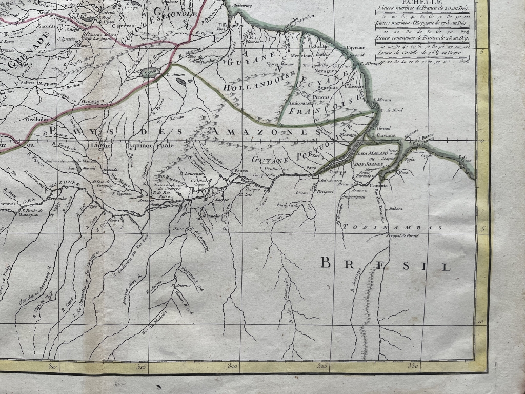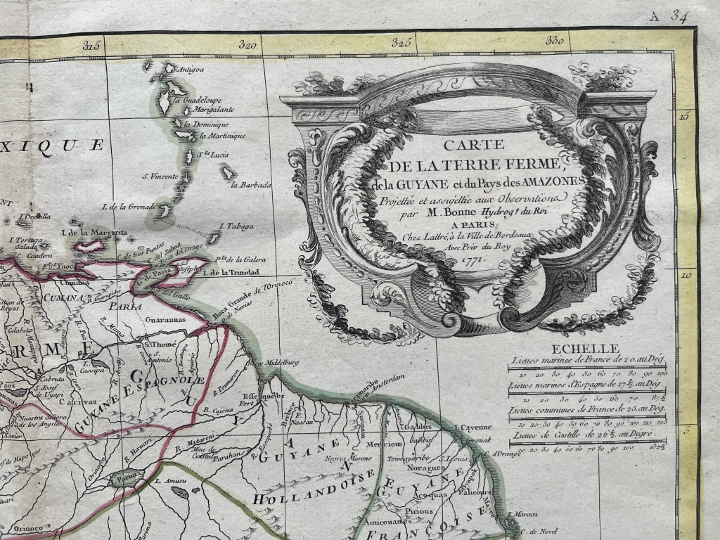 Es interesante como el autor de la cartografía, R. Bonne, incluye el mítico lado Parima. Posee en su margen superior derecho una espléndida cartela barroca en cuyo interior nos dan los nombre del autor del mapa y el editor del mismo y otros datos de interés. Debajo de la misma, posee una serie de escalas de medición. Está enmarcado en un recuadro graduado. Parcialmente coloreado.