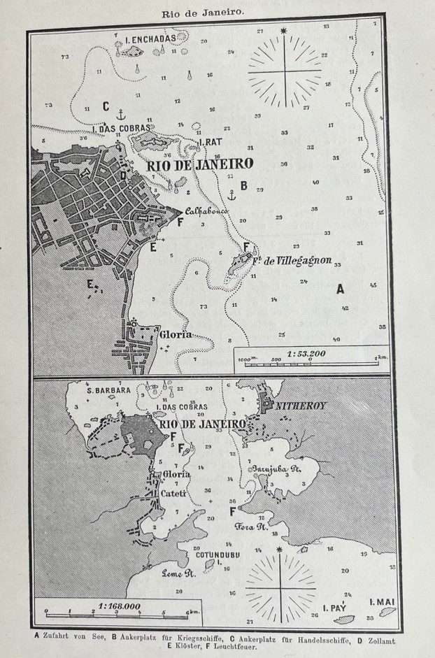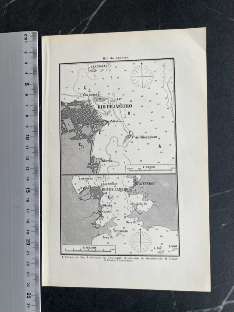 Se trata de hecho de dos cartografías: encima poseemos la que nos muestra el plano de la ciuda de Río de Janeiro (Brasil) con más detalle; y debajo poseemos otro mapa que amplia la zona de la citada ciudad hasta llegar a otros puntos geográficos próximo, como Niteroi, al otro extremo de la citada urbe. Posee escala, Rosa de los Vientos y debajo, podemos observar una serie en clave alfabética que señala los puntos más importantes marcados en el mapa de Río de Janeiro.