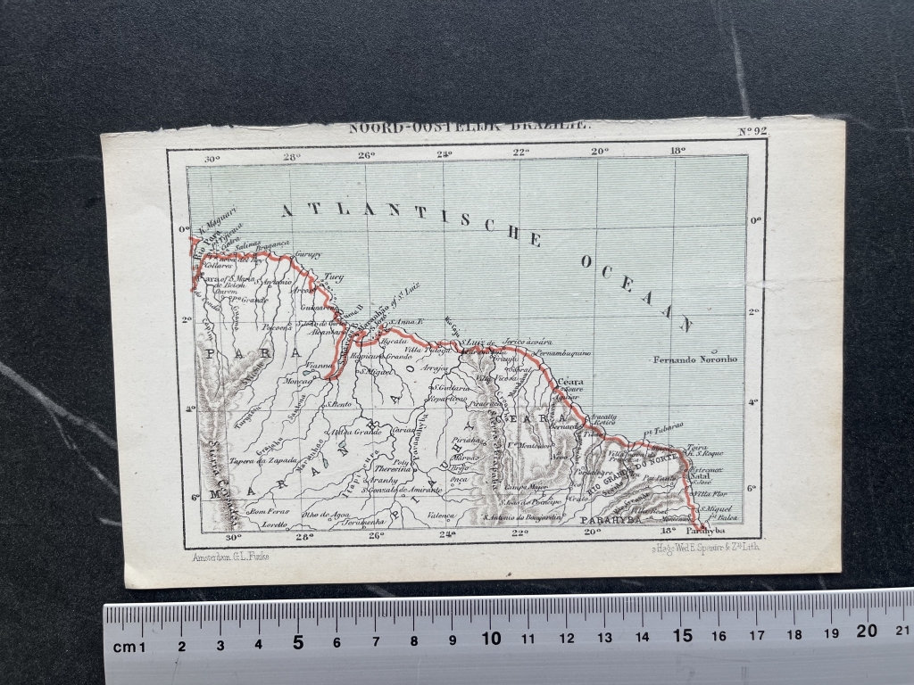 Se nos muestra en esta pequeña litografía coloreada, la parte nordeste de Brasil (América del sur), desde Belén de Pará hasta Paraíba, ya en la costa oriental atlántica. Enmarcado en un recuadro gradfuado.