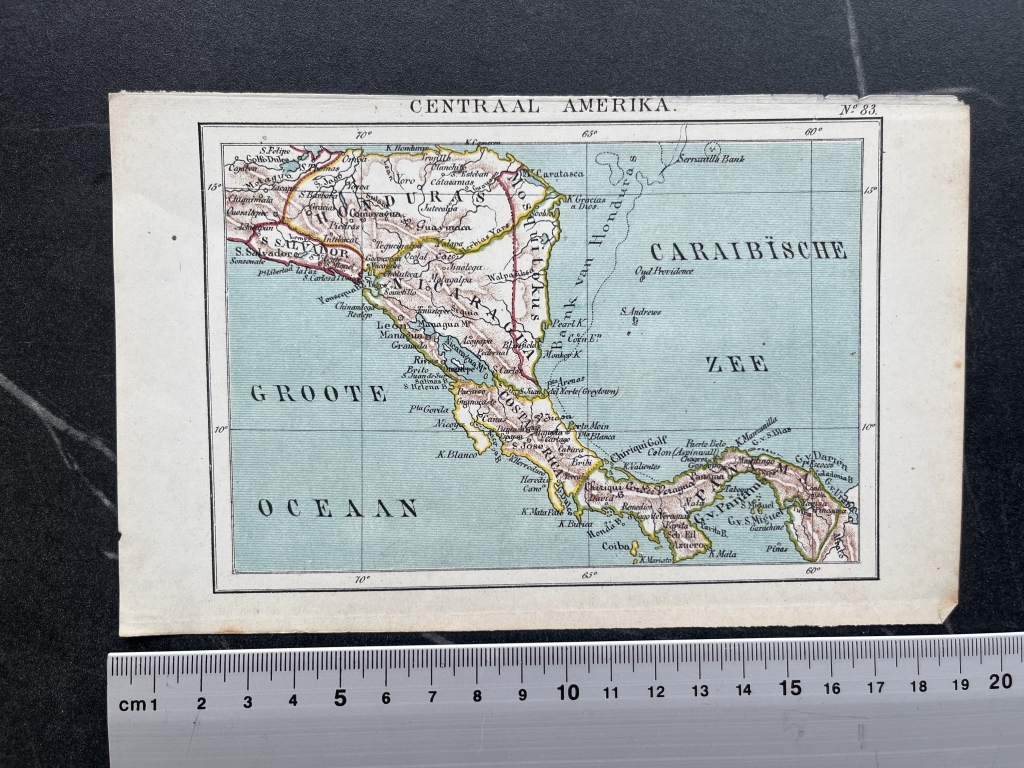 En esta pequeña litografía coloreada, se nos muestra los países que están en la América Central, como Honduras, El Salvador, Nicaragua, Costa Rica y Panamá, entre los océanos Atlántico y Pacífico. El mapa está enmarcado en un recuadro graduado.
