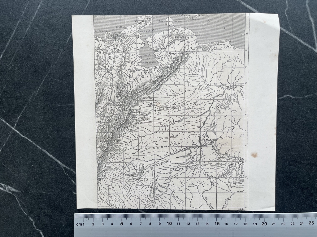 En esta hoja, poseemos en una página una impresionante e detallada vista del mercado de Cartagena de Indias, en la actual Colombia (América del sur), en donde sxe pueden ver los vendeddores y clientes nativos en un día cotidiano; y en la otra página, posee una mapa recortado de la zona norte de Venezuela, hacia el lago Maracaibo.