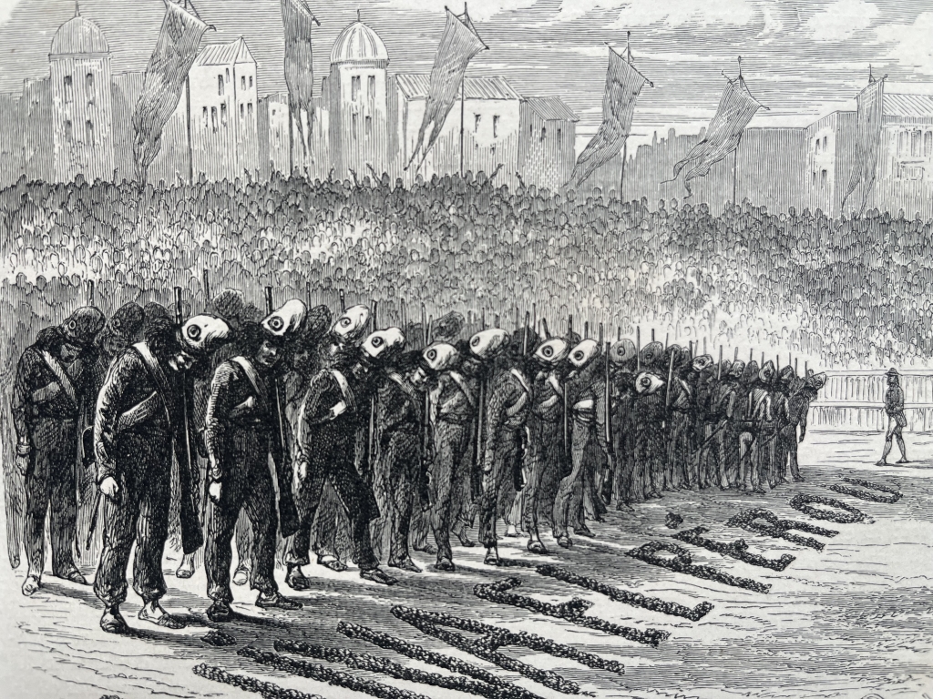 Se nos muestran soldados alineados en la plaza del Cabildo en la ciudad de Cuzco, en Perú (América del sur). Se puede leer a sus pies la consigna "VIVA EL PEROU" y al fondo una multitud de gente asistiendo a la celemoria militar.