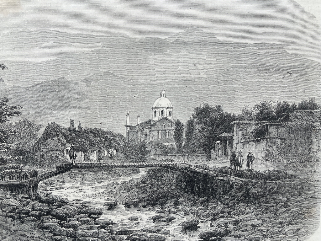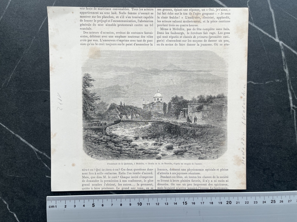 Se nos muestra el camino que conduce de La Quebrada a Medellín (Colombia, América del sur), en el que podemos ver un puentge sobre un río, varios personajes y un gran edificio al fondo.