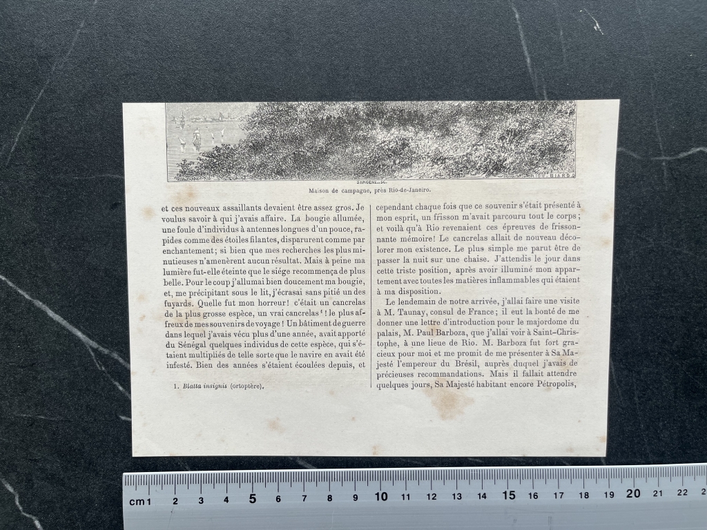 Grabado de placa de madera o xilografía extraído de una publicación francesa editada en 1861. El dibujo fue realizado por Riou y Etardy el grabado por Trichoin.