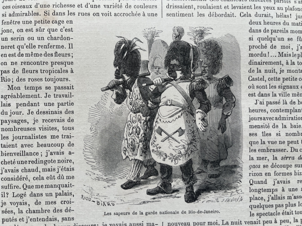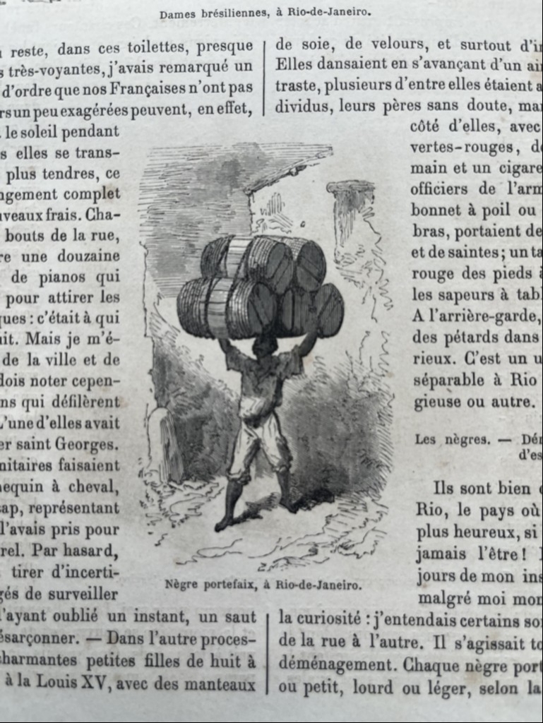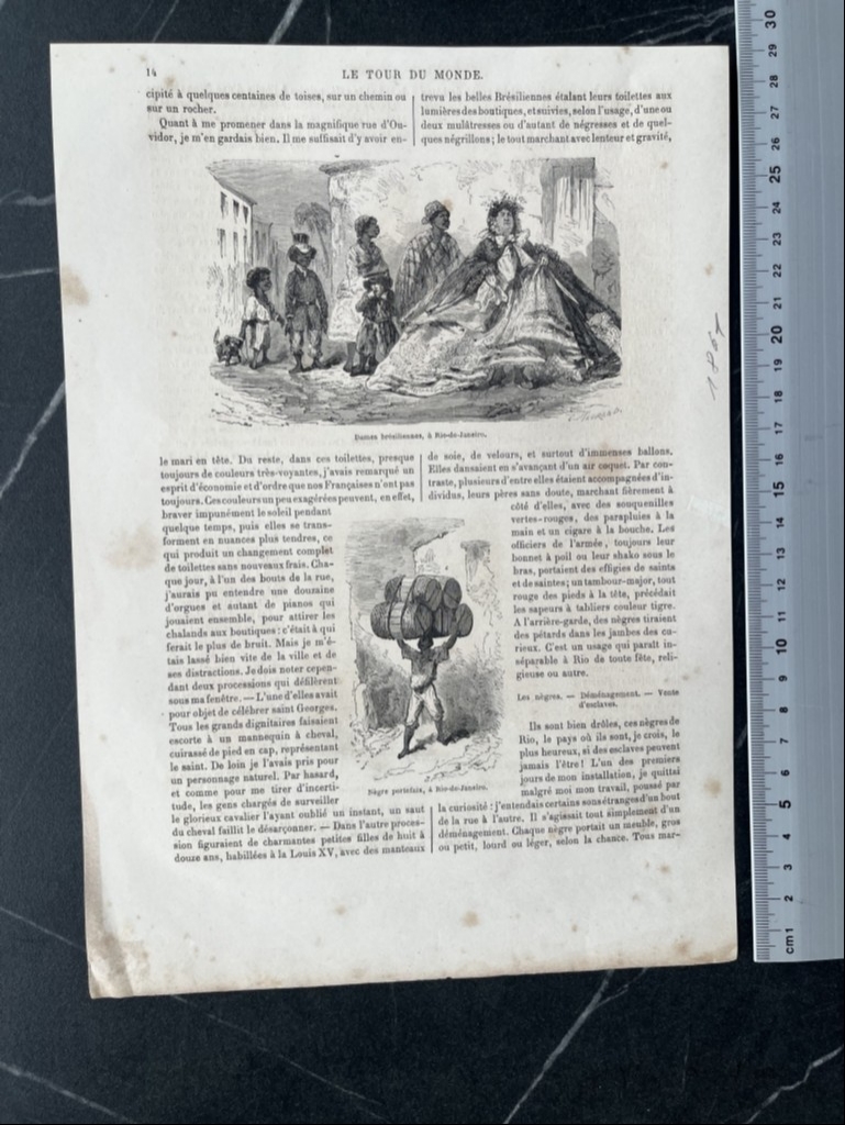 Se trata de una hoja que nos presentan cuatro grabados alusivos a personajes singulares de Río de Janeiro, en Brasil (América del sur. En una de sus caras podemos ver una ilustración de una dama de la ciudad y unhombre noegro, porteador de toneles; y en la otra, un hombre vestido elegantemente de negro y los zapadores de la guardia del palacio real.