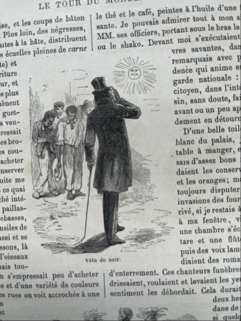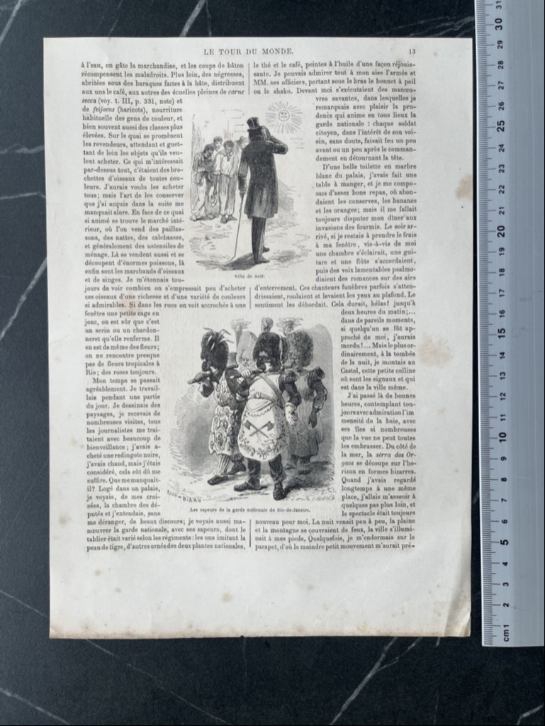 Xilografía o grabados de placa de madera extraídos de la publicación francesa Le Tour du Monde" editada en Paris en 1861. Los dibujos y los grabados en si, corresponden a varios autores, cuyos nombres podemos leer en la mayoría de las ilustraciones.