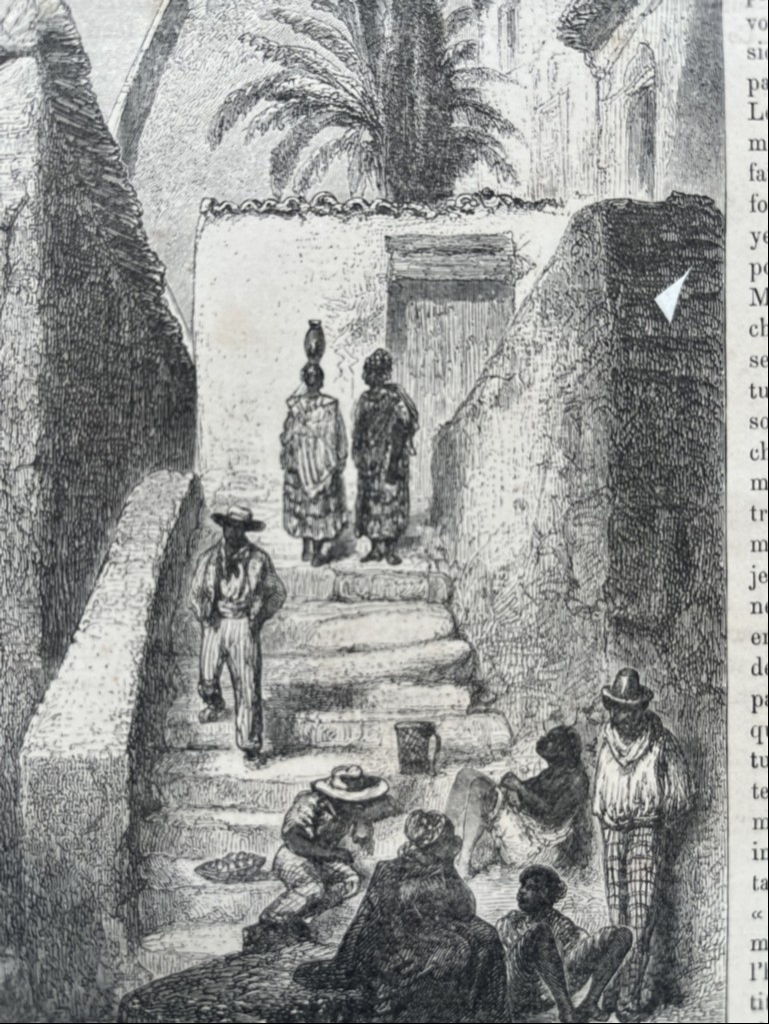 Xilografías o grabados de placa de madera de la publicación francesa Tour du monde editada en Paris en 1861. Una de ellas fue dibujada por Riou/Biard y grabaa por Gauchard y la otra nos ofrece el nombre el autor del grabado en su margen inferior-izquierdo.