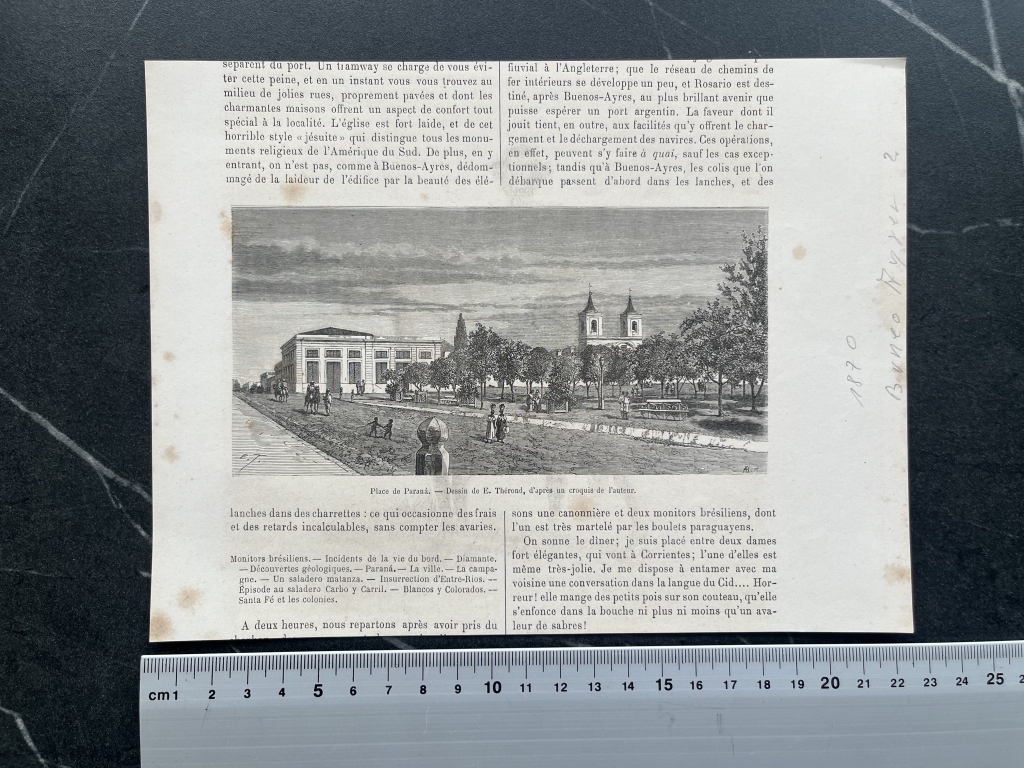 Se trata de una hoja que nos presenta por una de sus caras, una vista panorámica de una plaza en la localidad de Paraná, al oeste de Argentina; y en la otra un jinete armado con una larga, que denomina "insurgente", debido que en la época existieron confictos sociales en que estos personajes fueron muy populares.