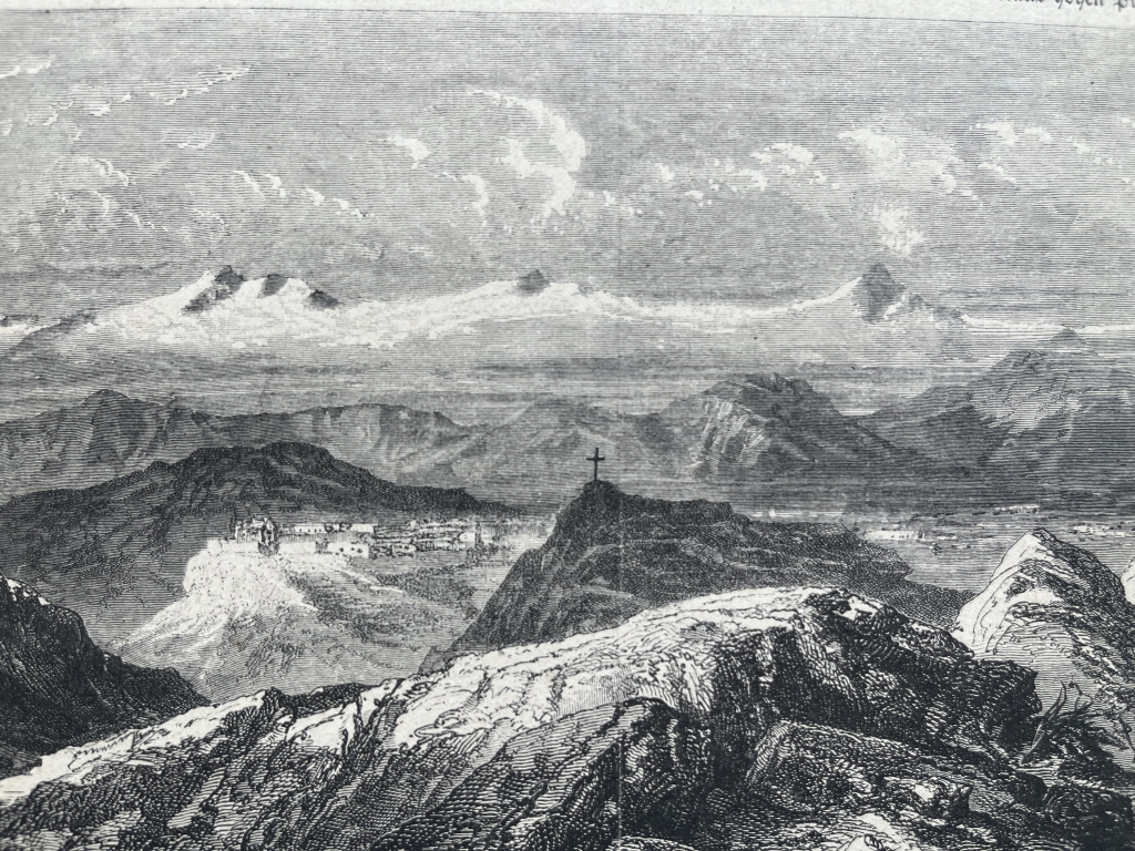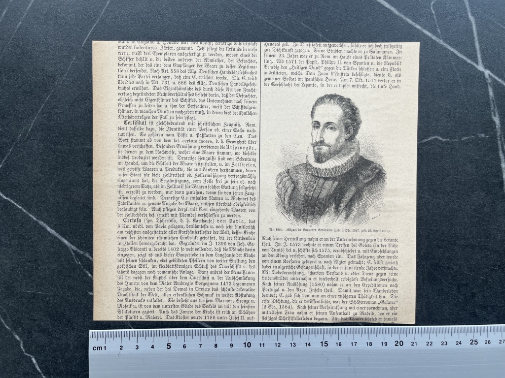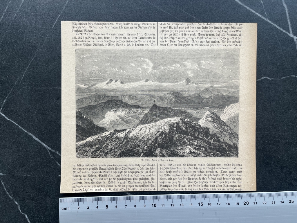 Se nos muestra una vista panorámica de la localidad minera de Cerro de Pasco, en Perú, América del sur. Por detrás, posee otra xilografía, representando un retrato del escritor español Miguel Cervantes.