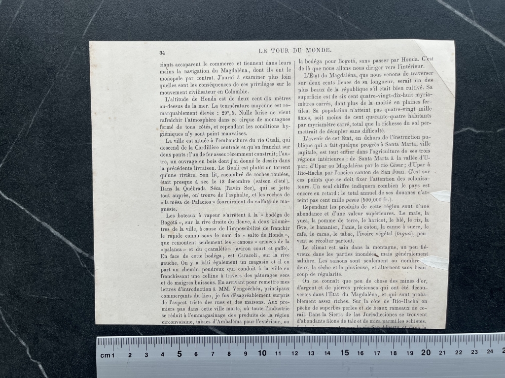 Xilografía o grabado de placa de madera, extraído de la publicación francesa La tour du monde editada en Paris en 1877.