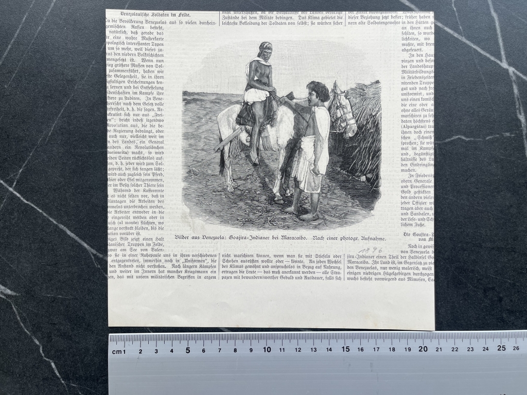 Se nos muestran a dos indígenas guahiros de la zona de Maracaibo, en el norte de Venezuela (América del sur). UNo a caballo y otro de pie, con su indumentaria típica.