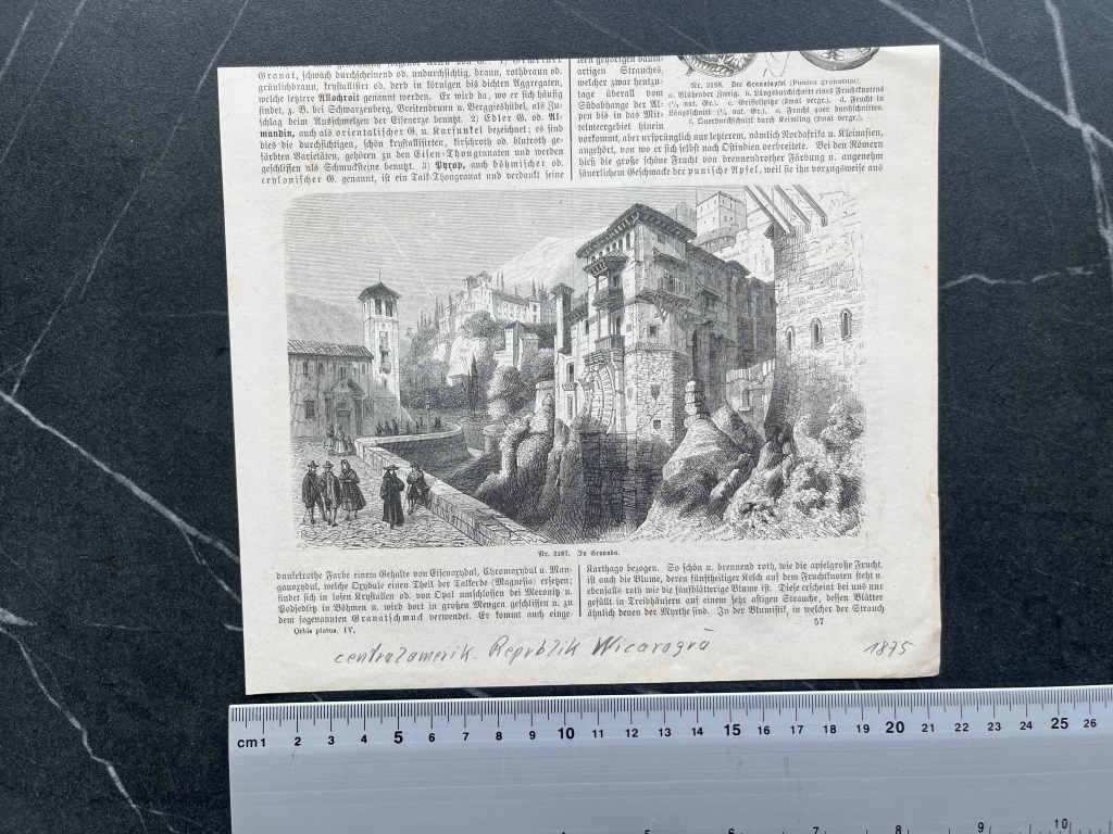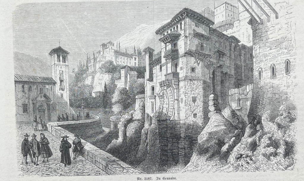 Se nos muestra una bella y rara panorámica parcial de la ciudad de Granada (Andalucía, España), con diferentes edificios relevantes de la época, en el centro y al fondo de la ilustración, que se completa con varios personajes de su vida cotidiana.