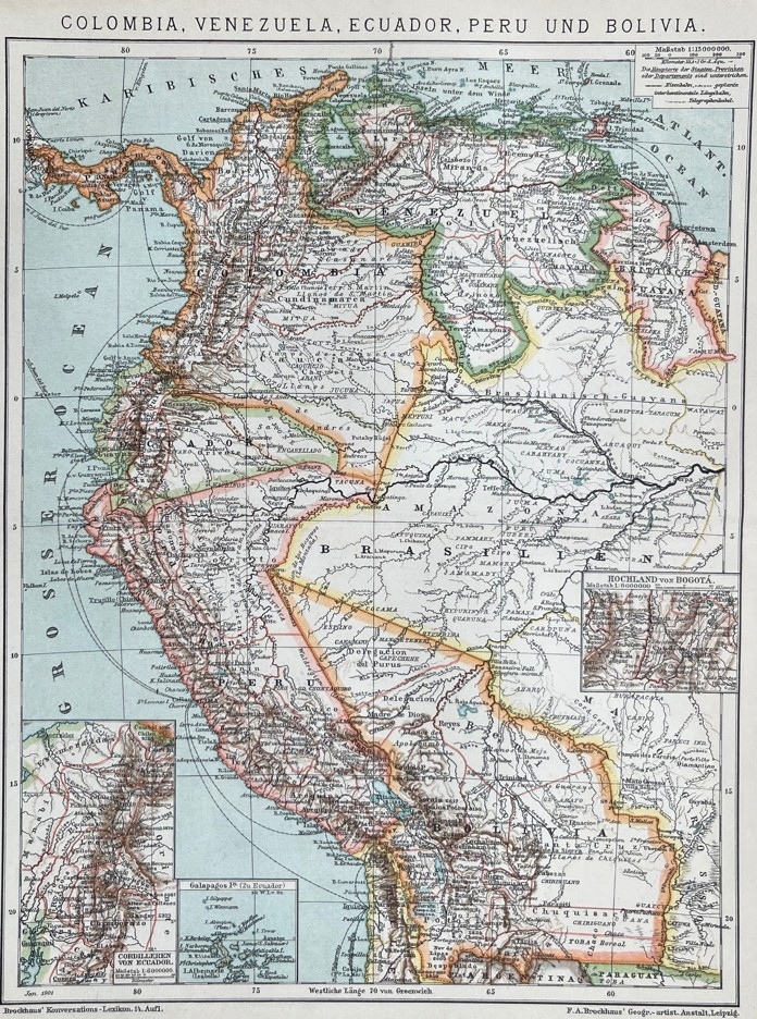 Colombia, Venezuela, Ecuador y Bolivia (América del sur), hacia 1890. Brockhaus