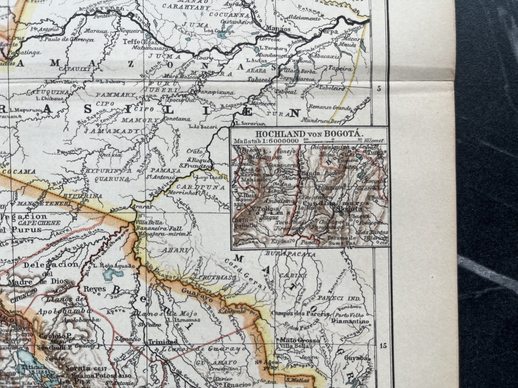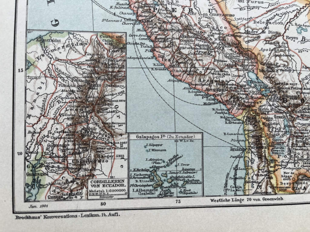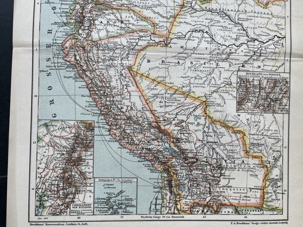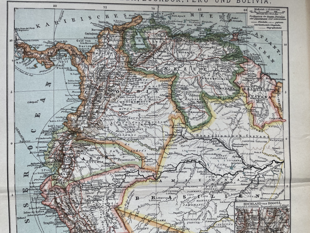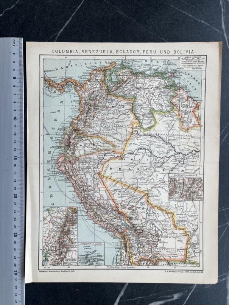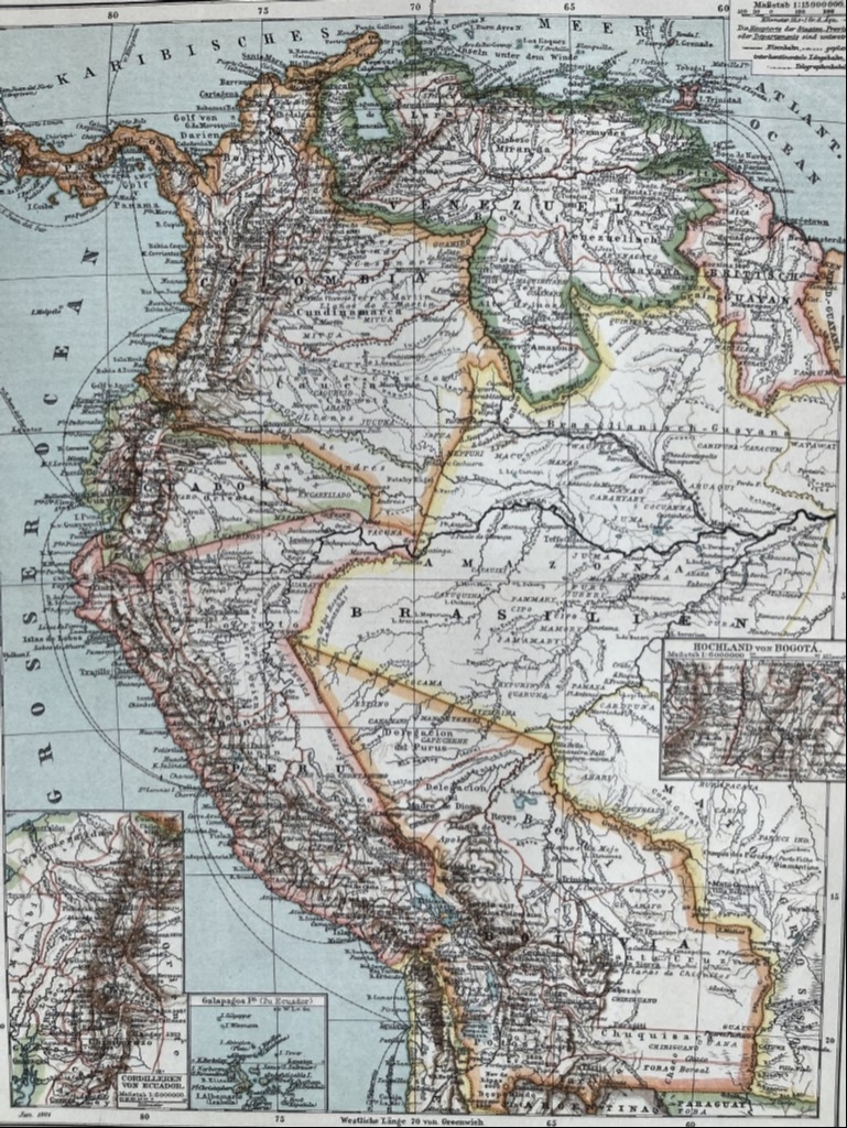 Se nos mustra en esta bella litografía coloreada los países de Colombia, Venezuela, Ecuador y Bolivia, así como zonas limítrofes. Se pueden localizar los accidentes geográficos más importantes y las localidades más relevantges en la e´poca. Posee trtes pequeños mapas insertados que nos señalan con etalle, la zona de Bogotá (Colobia), lasd islas Galápagos (Ecuador) y la cordillera de Chile. Todos estos países pertenecientes a América del sur.