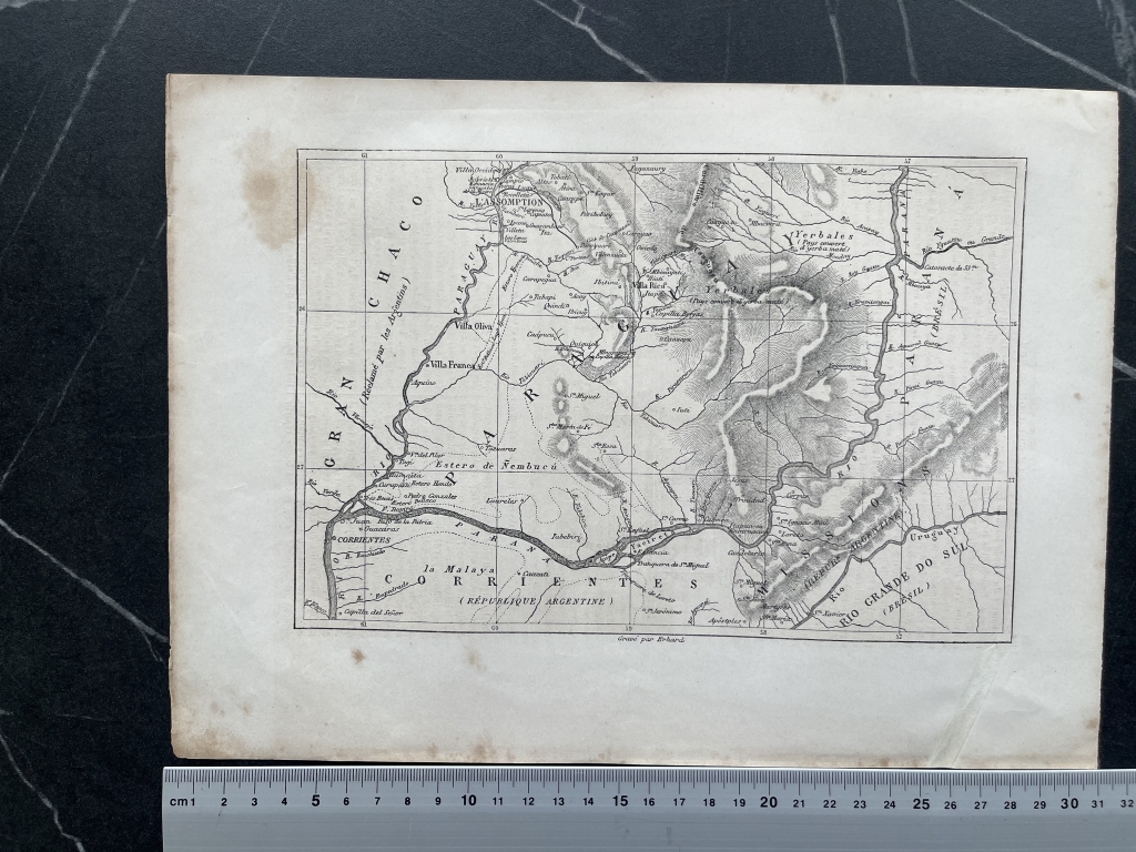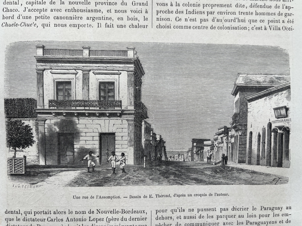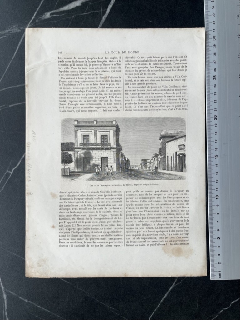En una de su caras posee una xilografía o grabado de madera, que nos muestra una calle del centro de Asunción, capital de Paraguay (América del sur). El autor del dibujo es Therond y el del grabado, Eur. Meunier. En la otra cara poseemos una mapa de Paraguay, desde Asunción a la frontera de Argentina. Grabado de placa de piedta o litografía realizada por Erhard.