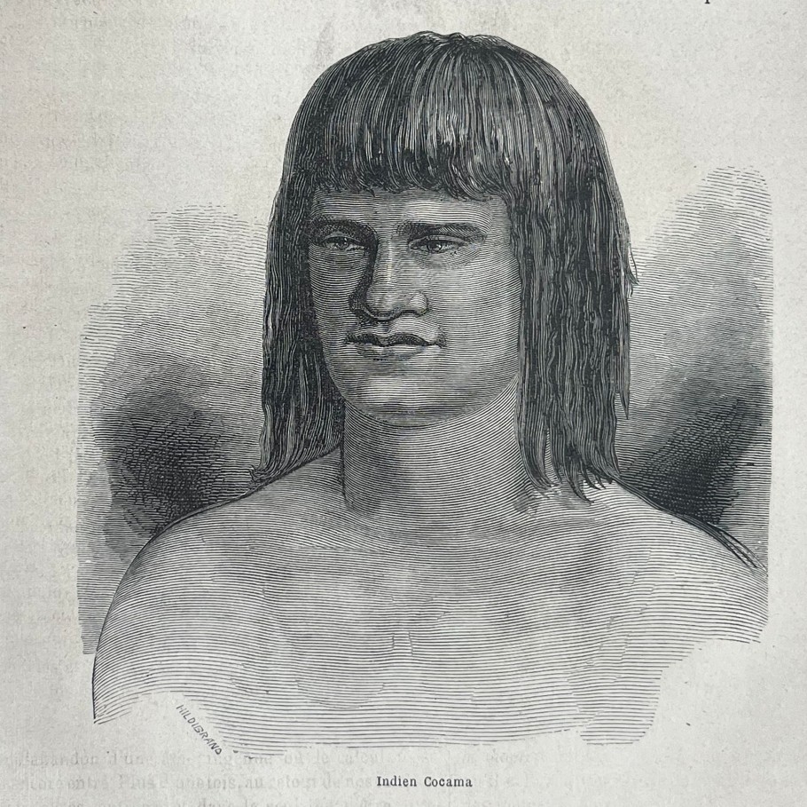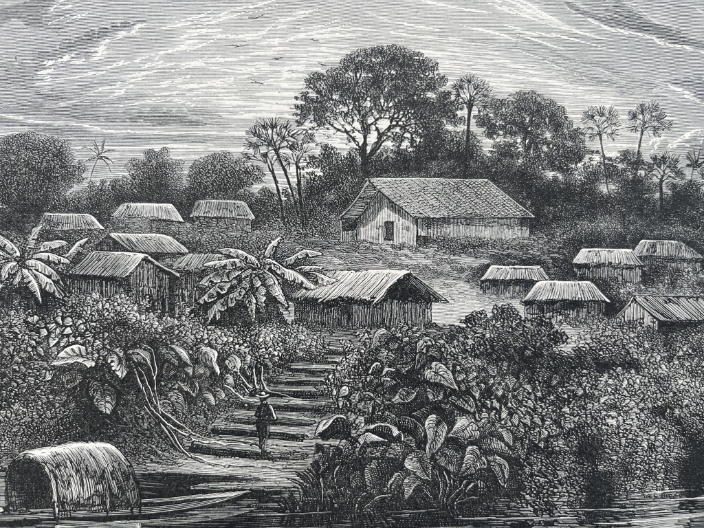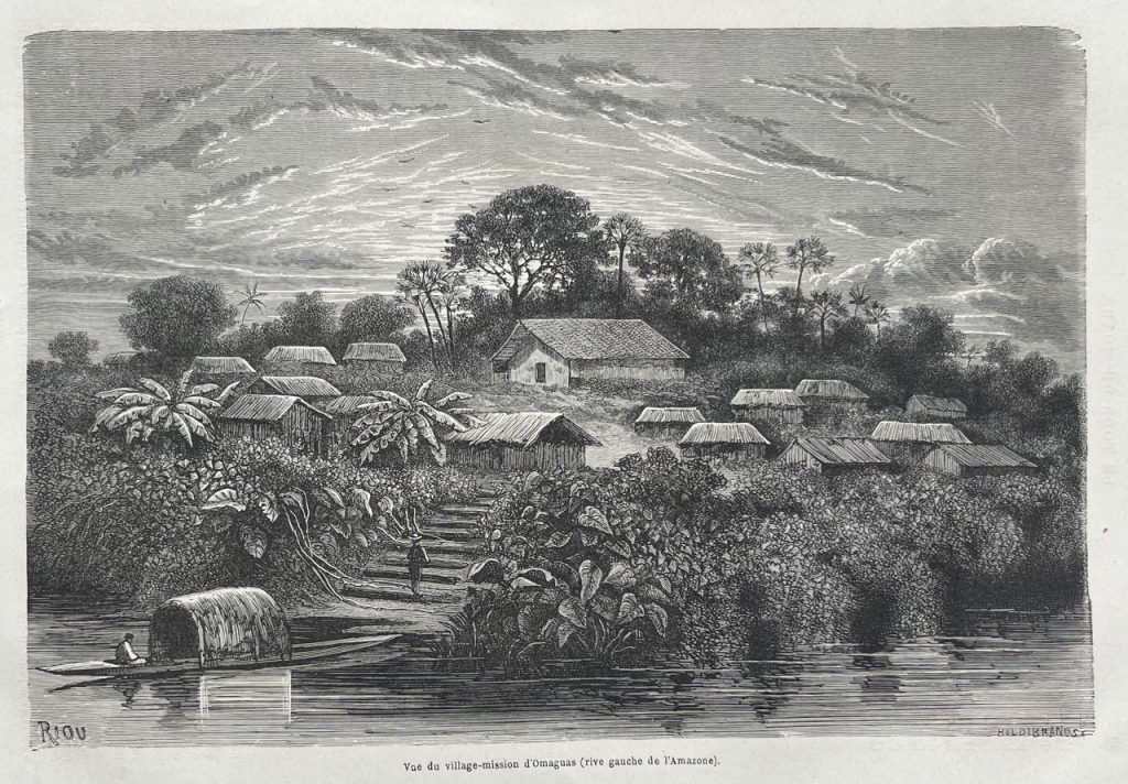 Vista de una misión de Omaguas (Perú) e indígena cocama, 1860. Riou/Hildibrand