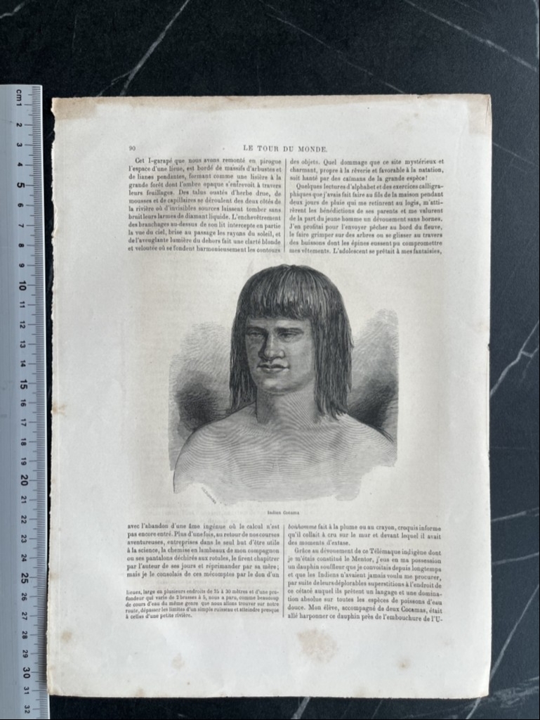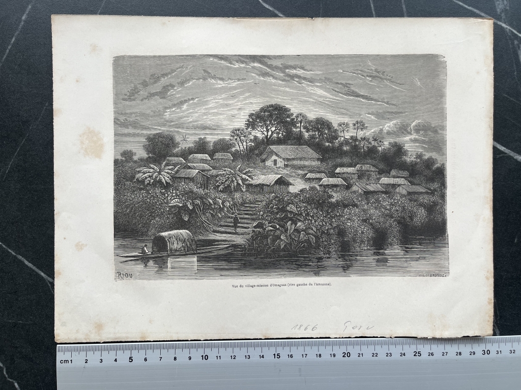 Se trata de una hoja que posee un grabado por cada una de sus páginas. En una de ellas, se nos muestra un a bella vista panorámica de una villa y misión de los Omaguas, en la orilla izquierda del río Amazonas, en Perú (América del sur), dibujada por Riou y grabado por Hildibrand, pudiendo ver sus cabañas y una embarcación en el río; yen la otra, podemos ver un retrato de medio cuedrpo de un indígena de la tribu de los cocamas. Grabado de Hildibrand