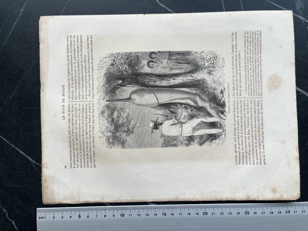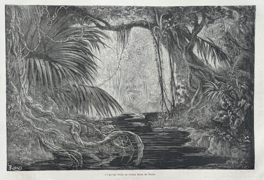 Se trata de una hoja que posee grabados por sus dos páginas. En una de ellas podemos ver un paisaje cercano a Nauta (Perú, América del sur), en concreto la zona denominada "Igarapé" (en brasileño) o ribera negra, cercana a dicha localidad. Dibujada por Riou y granada por Laly. Y en la otra pñagina, podemos ver un hombre de pie, abriendo un delfín amázónico que se enceuntra colgado para facilitar la tarea. El dibujo es de Riou.
