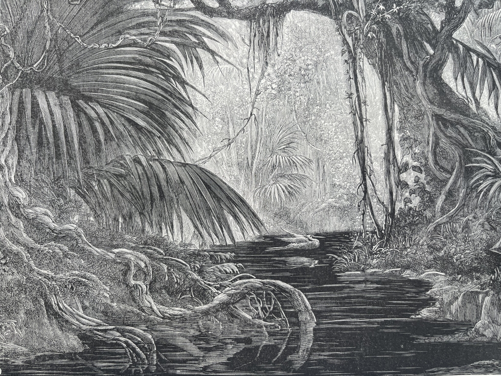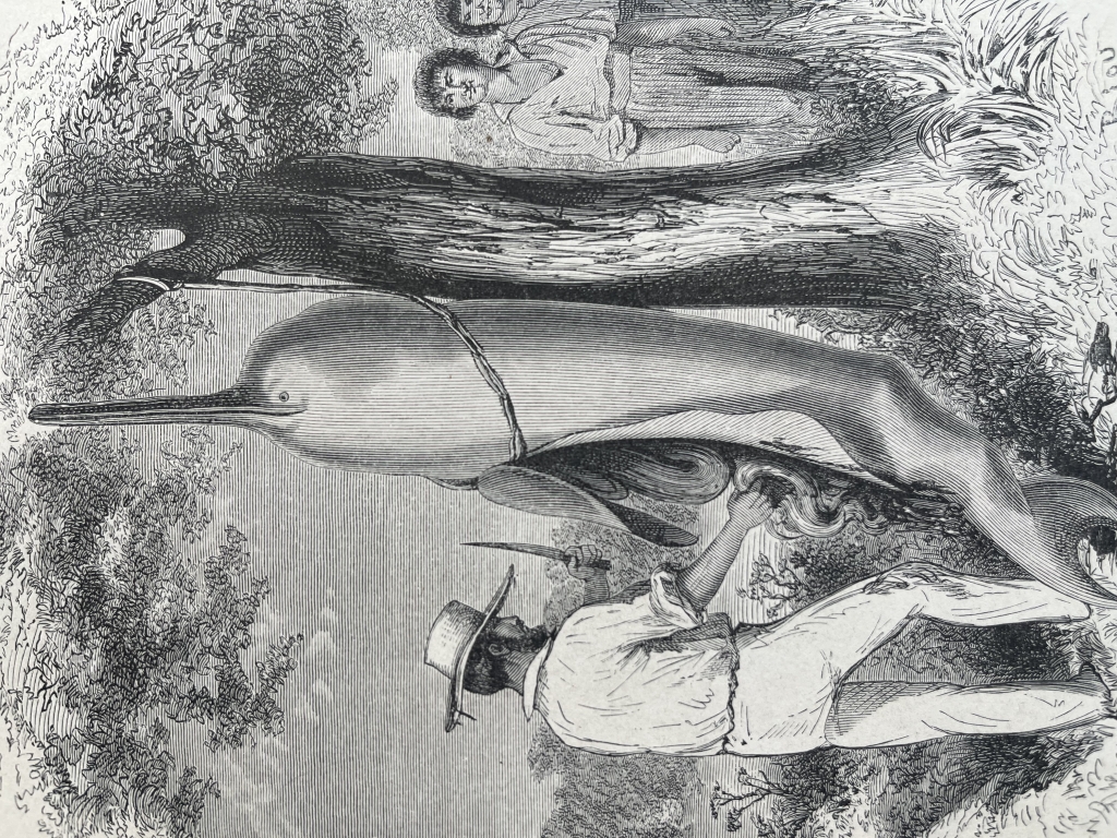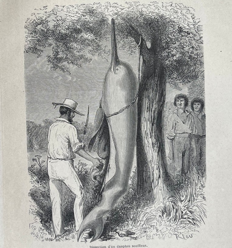 Paisaje cerca de Nauta (Perú, América del sur) y delfín del Amazonas, 1866. Riou/Laly