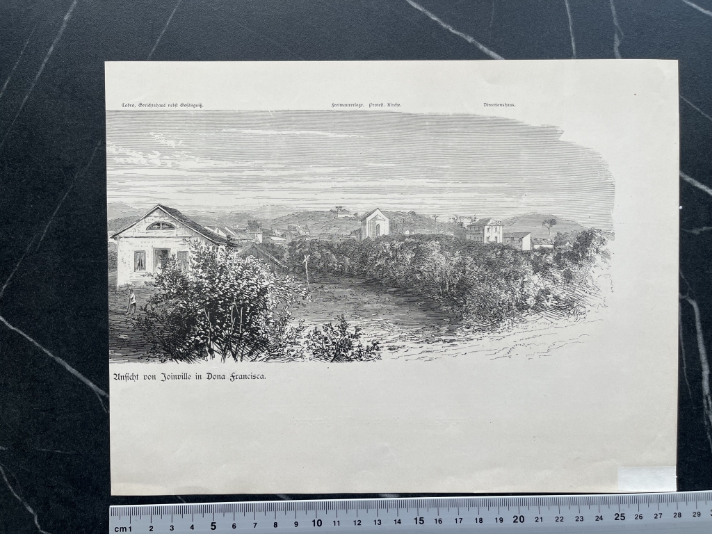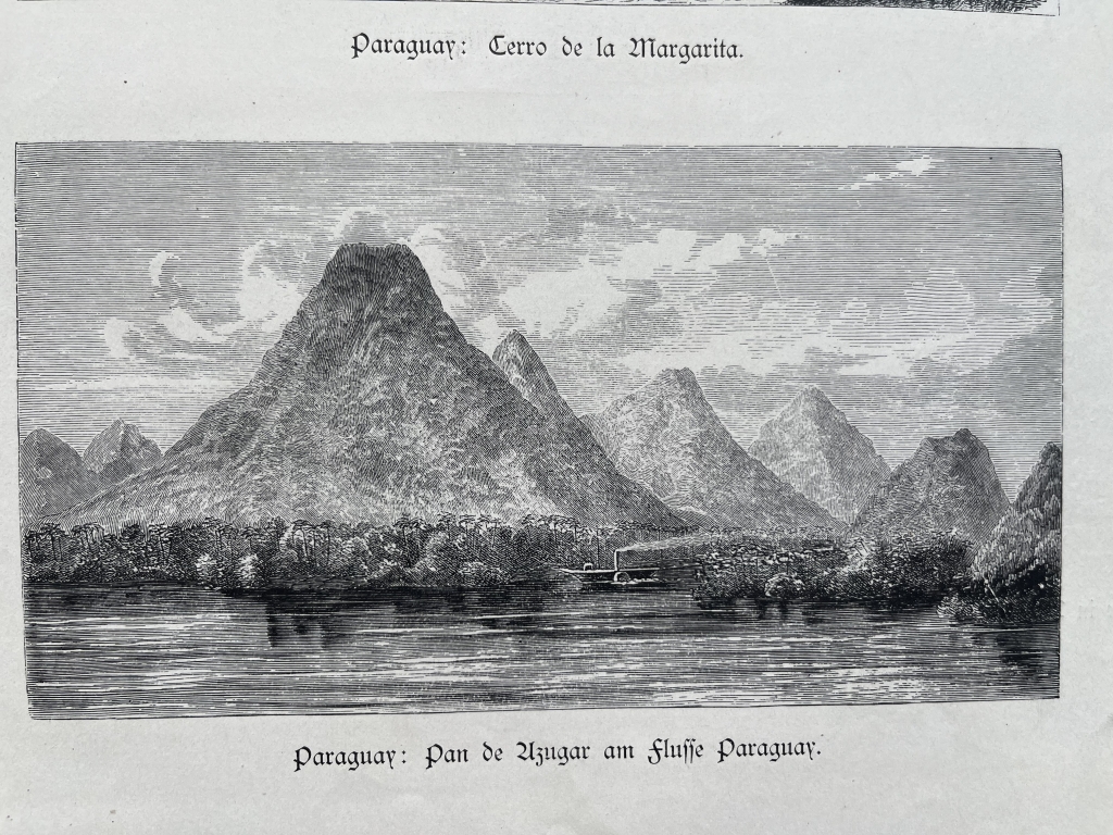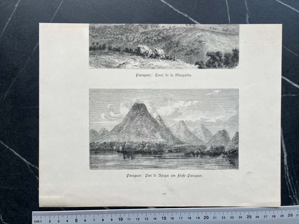 Se trata de un recorte de210x285 una hoja que posee en cada una de sus caros grabados: así en una de ellas posee un grabado completo que representa el poco conocido Pan de Azucar del río Paraguay, en el país del mismo nombre, en América del sur), poseyendo otro grabado pero cortado cuto pie de ilustarcxión lo identificado como el Cerro ded la Margarita en el mismo país; y en la otra página podemos ver otro grabado, parcialmente recortado en uno de sau lados que corresponde a la olonia de santa Francisca, cerca de la ciudad brasileña de Joinville, en el estado santa Catarina.