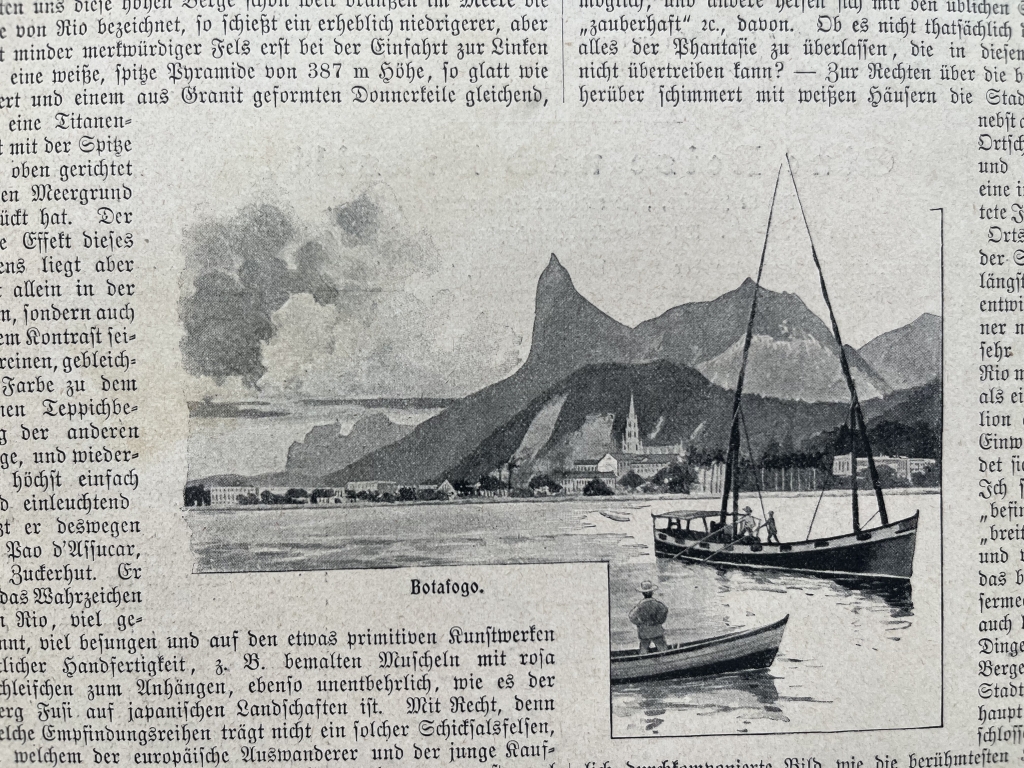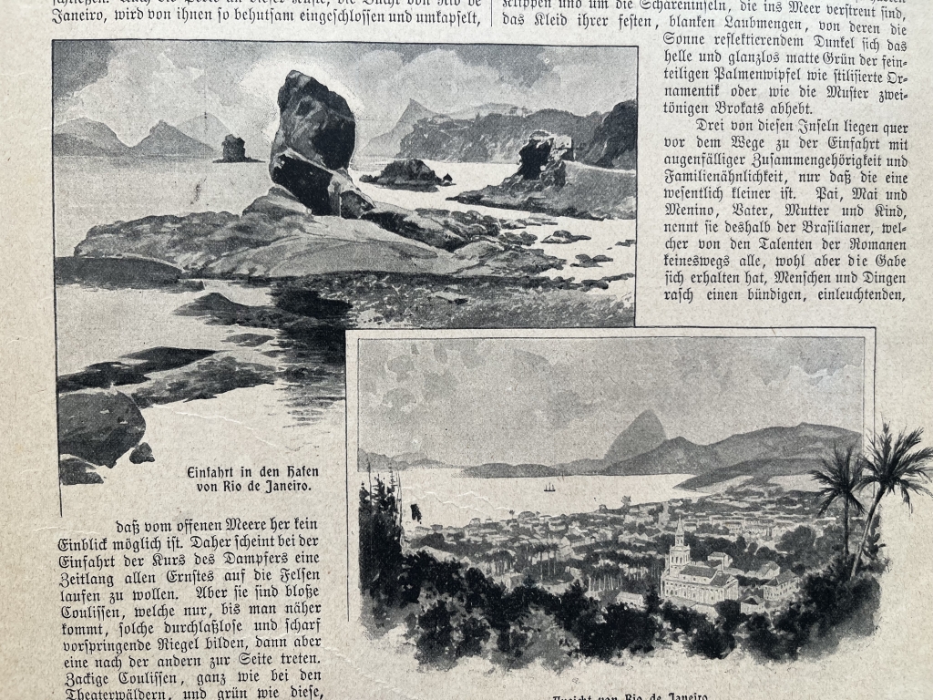 Se trata de un recorte de una hoja que posee en las dos páginas pequeños grabados de los paisajes más atracticos de Río de Janeiro (Brasil). En una de sus página, venos una composición de una vista de la entrada a la bahía de la ciudad y una vista de la misma, en la que destaca el Pan de Azucar; y en la otra página, poseemos una bella panorámica de la zona de Botafogo, barrio peculiar de esta urbe.