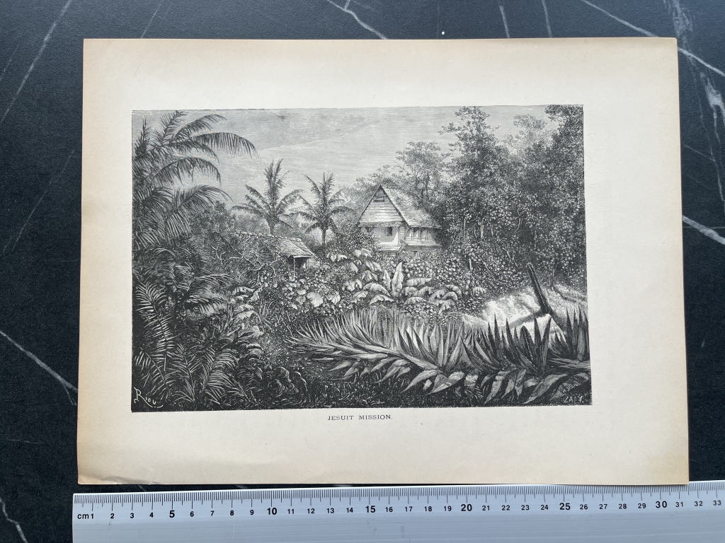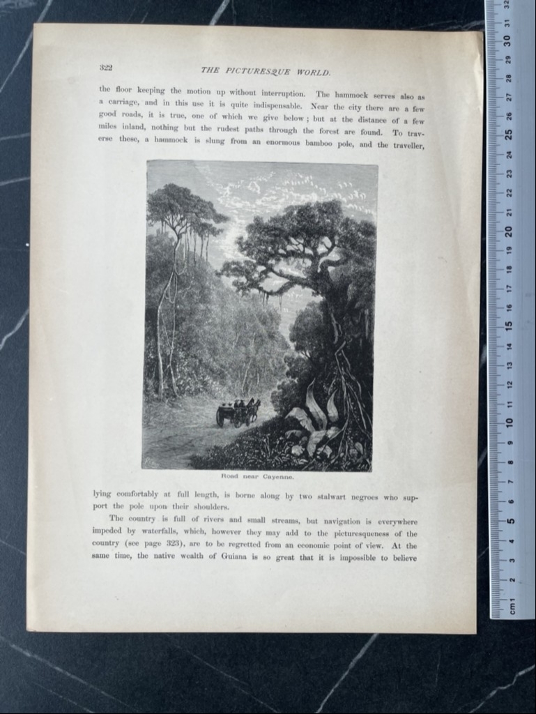 Se trata de una hoja que posee en una de sus páginas, la representación de una misión jesuítica de América del sur y en la otra página, una vista de una carretera de Cayena (Cayenne, en francés), en la Guayana francesa, situada en la parte superior de sudamérica.