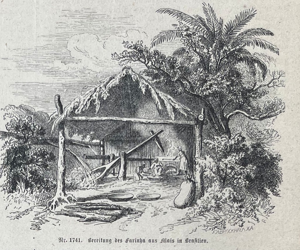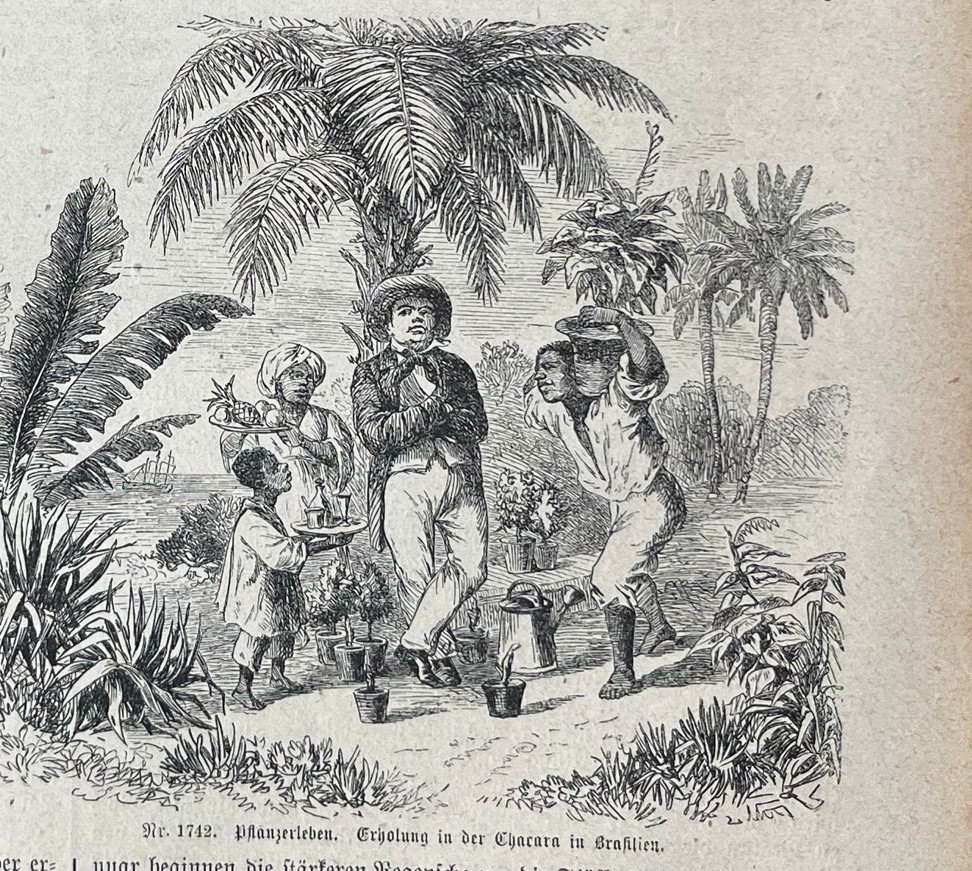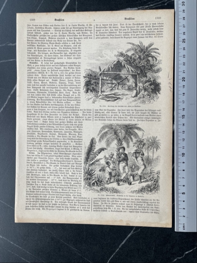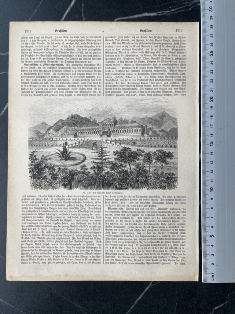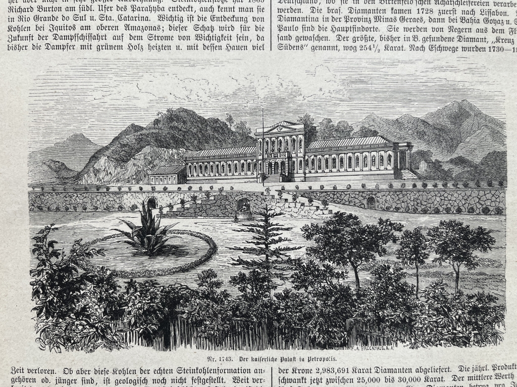 En la misma hoja se nos muestra en una cara, dos pequeños grabados represenando una pequeña fábrica de harina y en el otro, un hacendado,con sus servidores; y en la otra cara poseemos una bella vista del palacio imperial de verano, cerca a la ciuda de Río de Janeiro (Brasil, América del sur). Los nombre de los autores de las citadas xilografías se pueden leer en la parte inferior-derecha de las mismas.