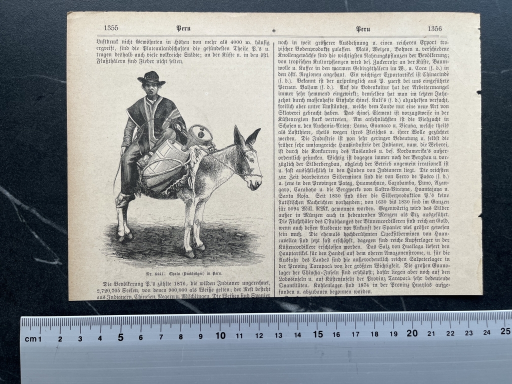 Se nos muestra en una de las páginas de este recorte de hoja, un cholo o lo que es lo mismo el nativo o mestizo de Perú. En este caso está montado sobre un animal de carga, con su indumentaria típica y su utillaje habitual. Por la otra cara, posee un retrato histórico.