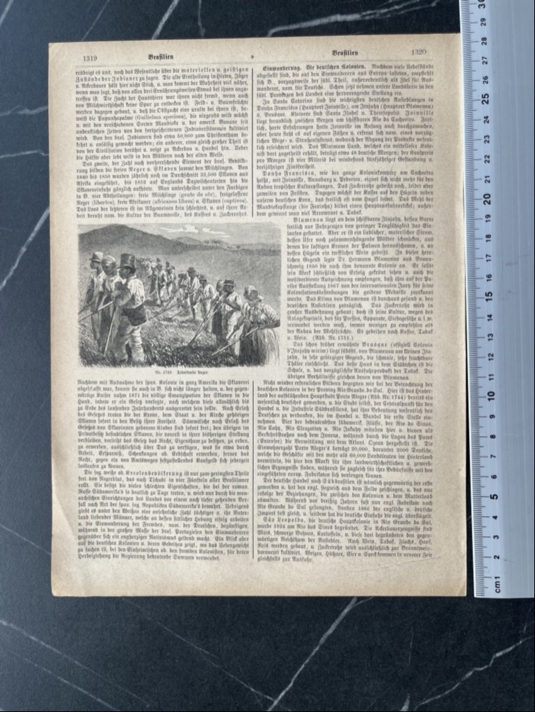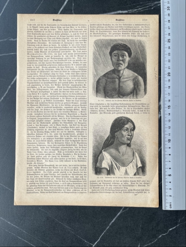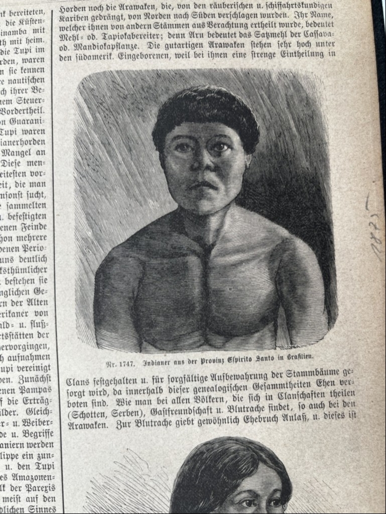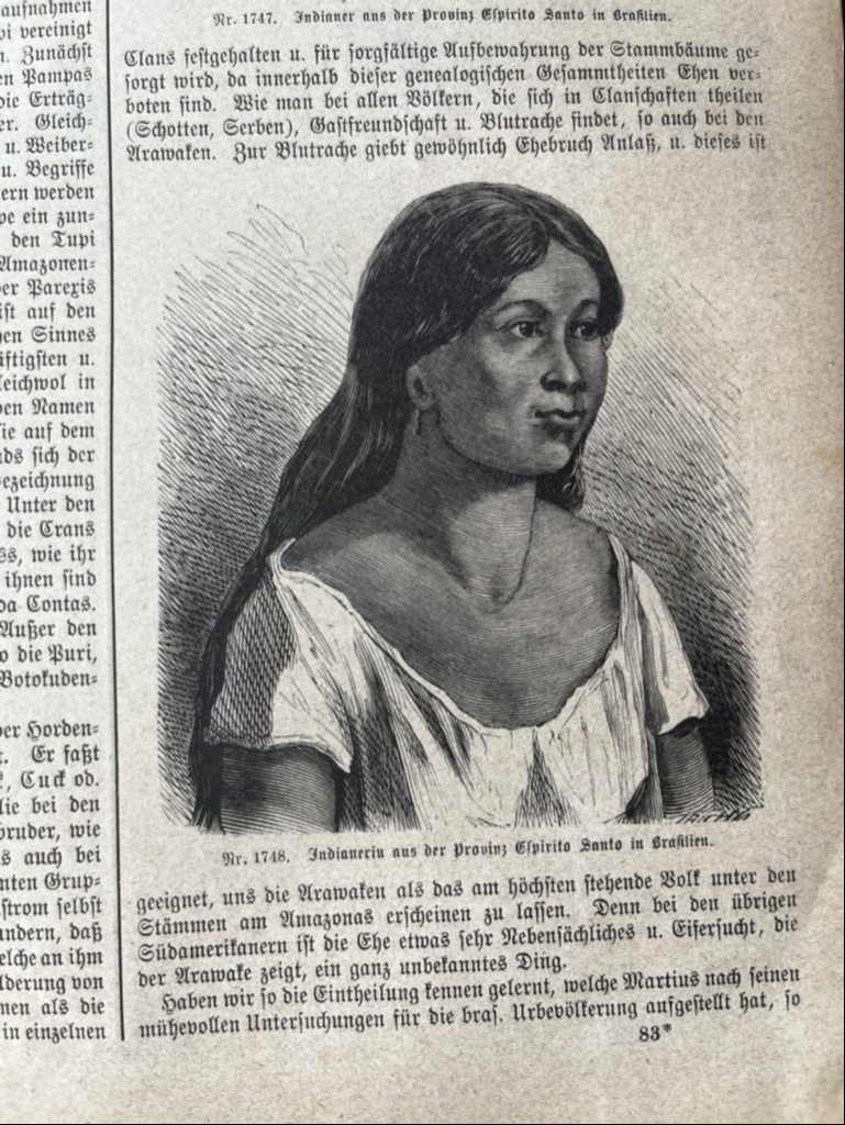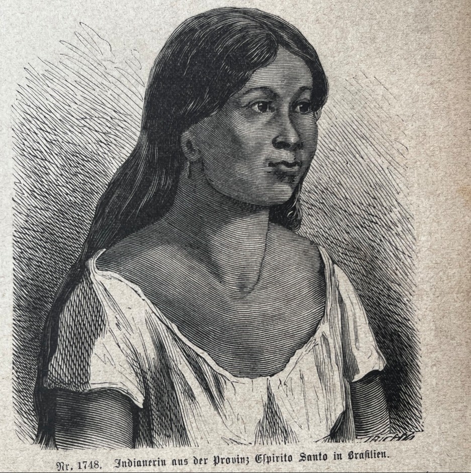 En una de su páginas tenemos los retratos de medio cuerpo de un nativo y una nativa del estado de Espíritu Santo, estado litoral de Brasil (América del sur); y en la otra pñagina, podemos ver una ilustración referida a los trabajos agricolas en dicha zona geográfica.