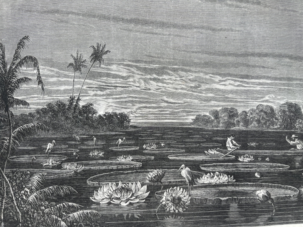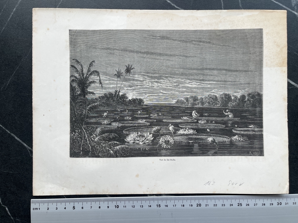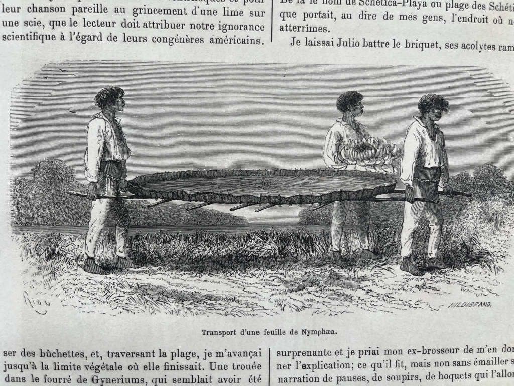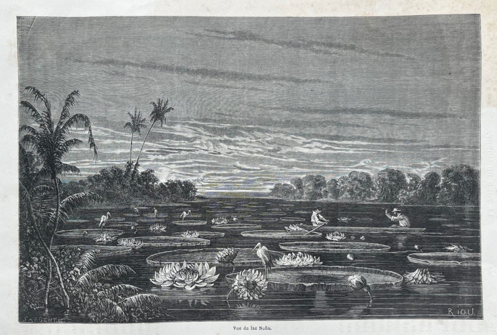 Lago de Nuña y transporte de hojas de nymphaea (Perú), 1862. Riou/sargent/Hildibrand