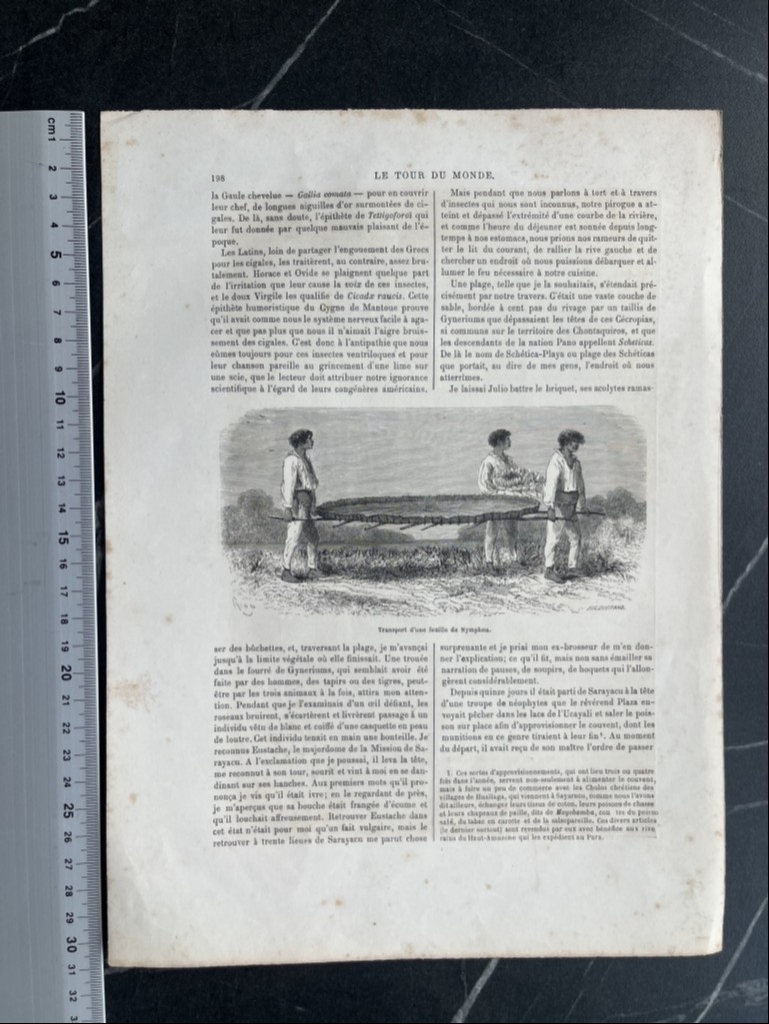 Se trata de una hoja que posee dos grabados, uno por casa una de sus páginas. En una de ella, a toda página, podemos ver una vista del denominado lago de Nuña, en Perú (América del sur) en que se pueden ver numerosas plantas acuáticas de la familia de las nymphaeas, así como aves y en el centro dos hombres en una embarcación. El dibujo es de Riou y el grabado de Sargent; y en la otra, podemos ver el transporrte de una gran hoja de esa planta, que es llevada paor cuatro personas. El dibujo es de Riou también, pero el grabado es e Hildibrand.