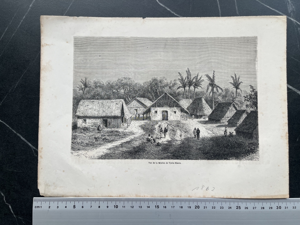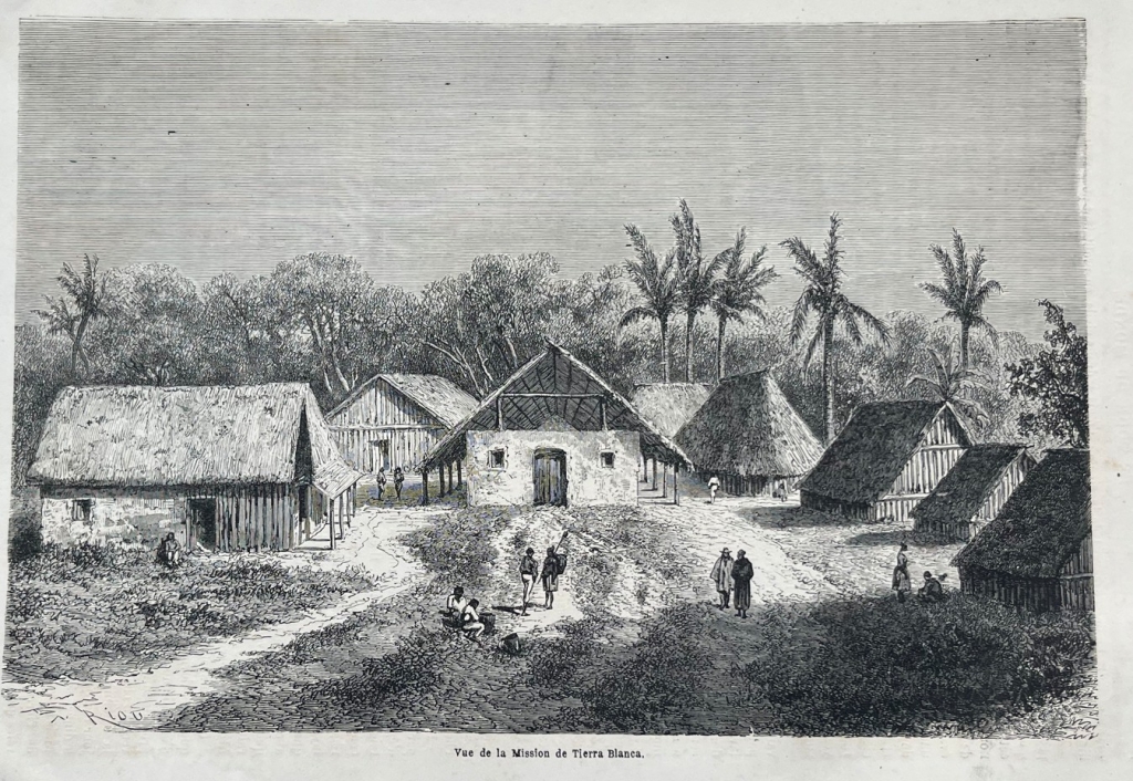 Se nos muestra a toda página, una vista parcial de la misión de Tierra Blanca, en Ucayali, al ruroeste de Loreto, en Perú (América del sur). Podemos ver varios cabañas y diferentes personajes en su vida cotidiana.