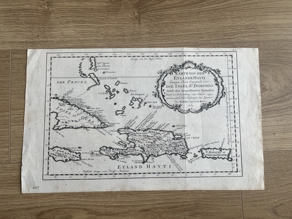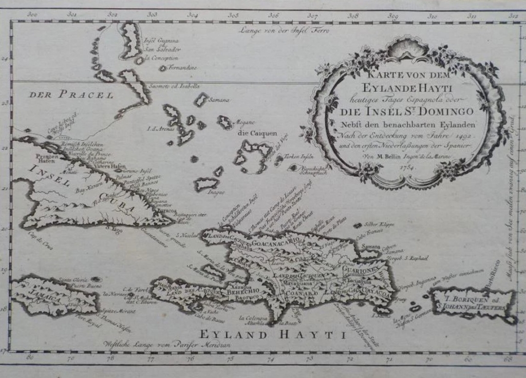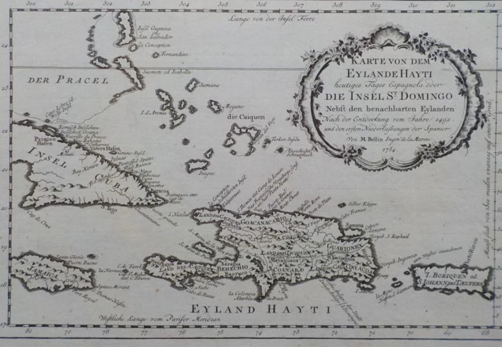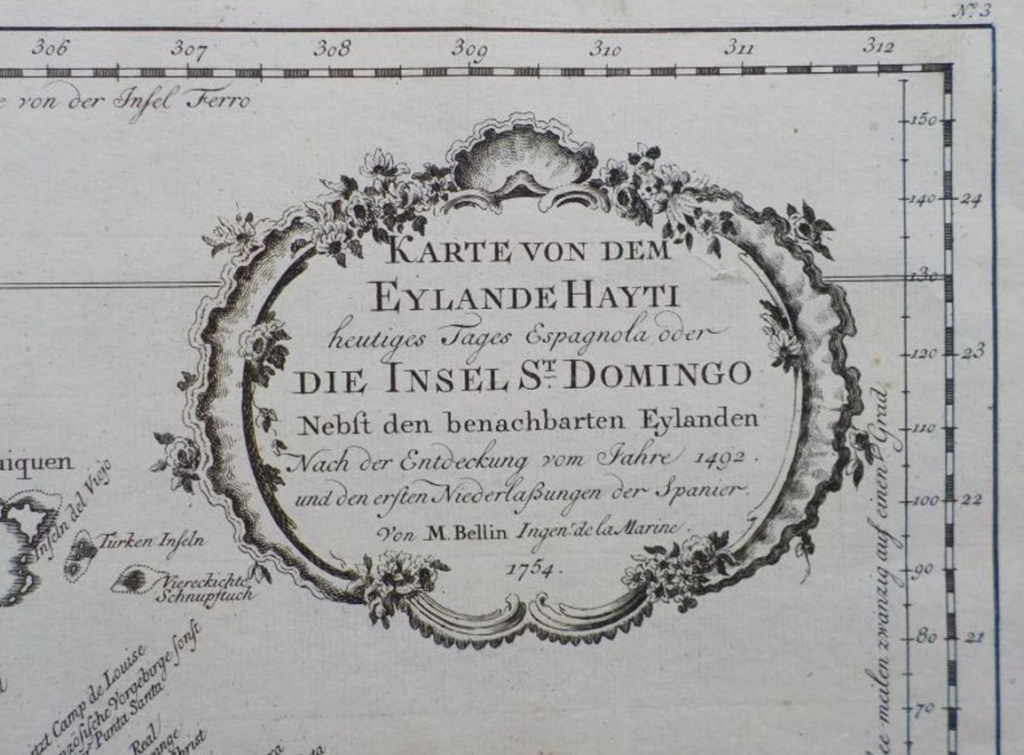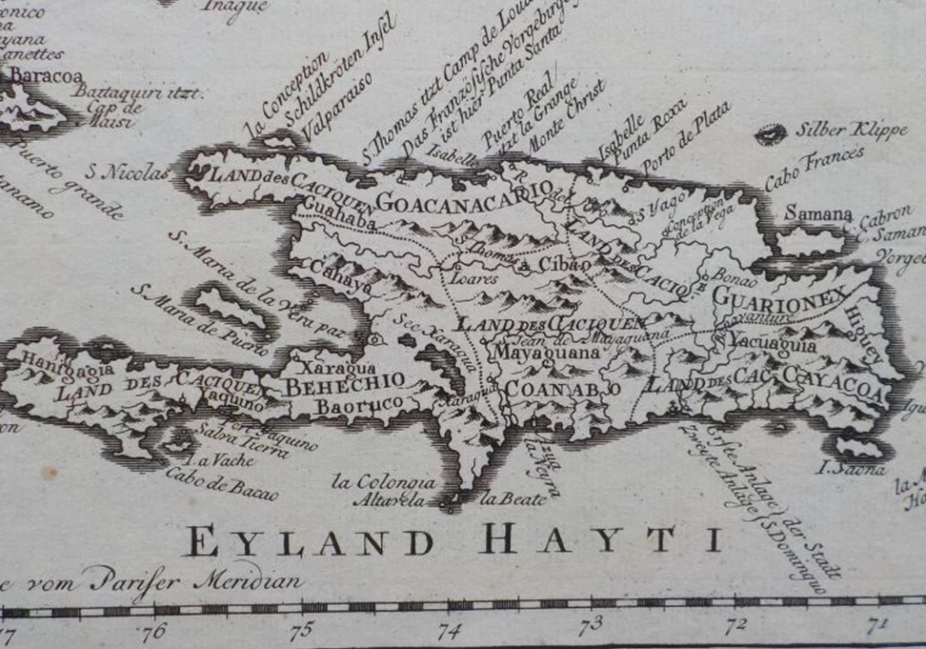 Título original:"Karte von dem Eylande Hayti heutiges Tages Espagnola oder die Insel St. Domingo Nebst den benachbarten Eylanden Nach der Entdeckung vom Jahre 1492 und den ersten Niederlassungen der Spanier."