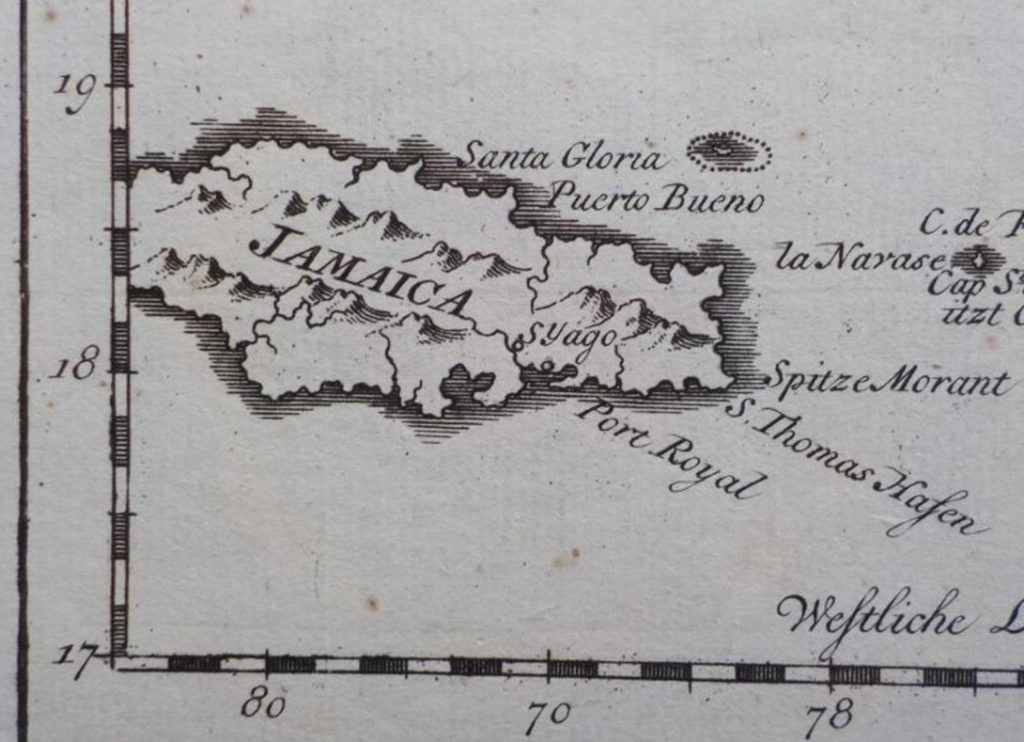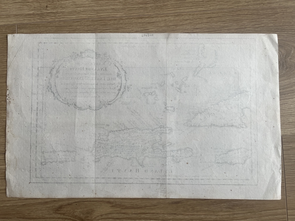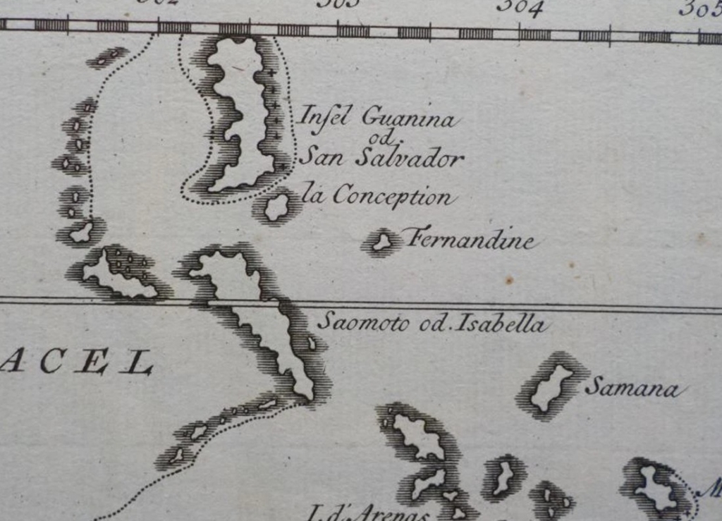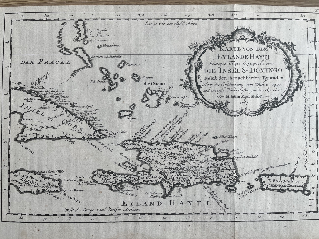 Título original:"Karte von dem Eylande Hayti heutiges Tages Espagnola oder die Insel St. Domingo Nebst den benachbarten Eylanden Nach der Entdeckung vom Jahre 1492 und den ersten Niederlassungen der Spanier."