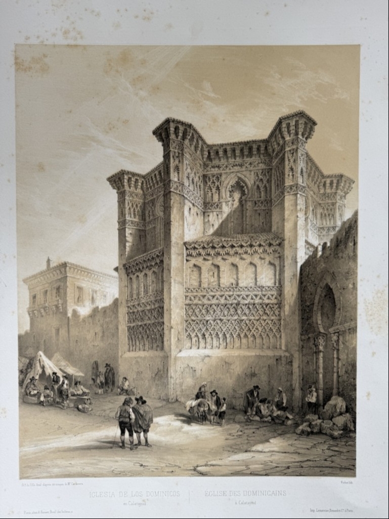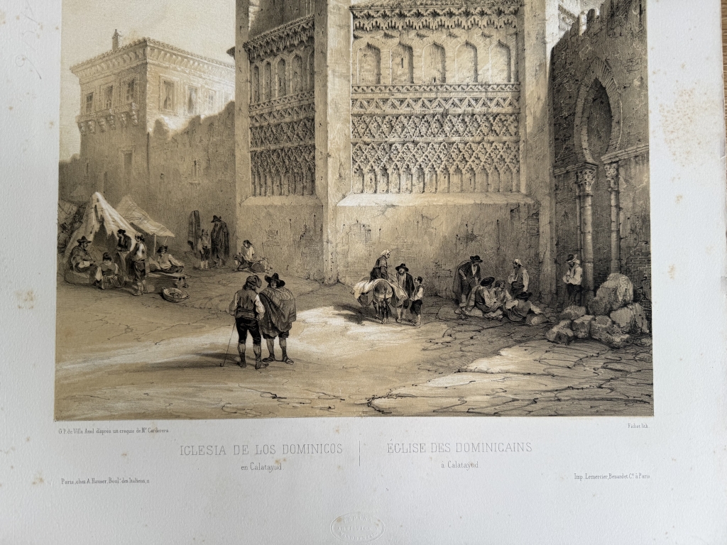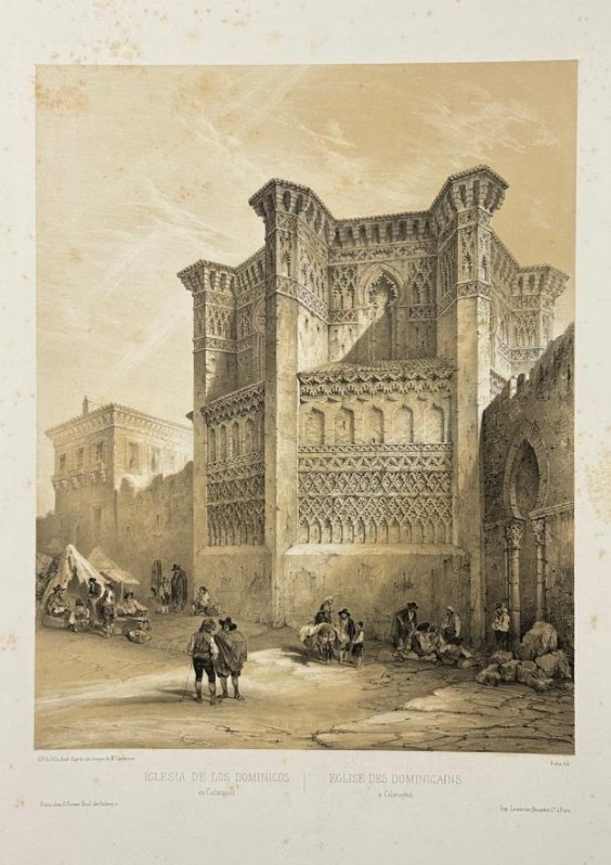 Descripción: Impresionante y muy detallada vista litográfica original de 1842 de Jenaro Pérez de Villaamil, tomando un croquis de Carderera, de la iglesia mudéjar de los Dominicos en Calatayud, Zaragoza (Aragón, España). Extraordinaria arquitectura con todo tipo de detalles dcecorativos y estructurales.Varios habitantes adornan la vista. Grabado por Fichot e impreso por Lemercier