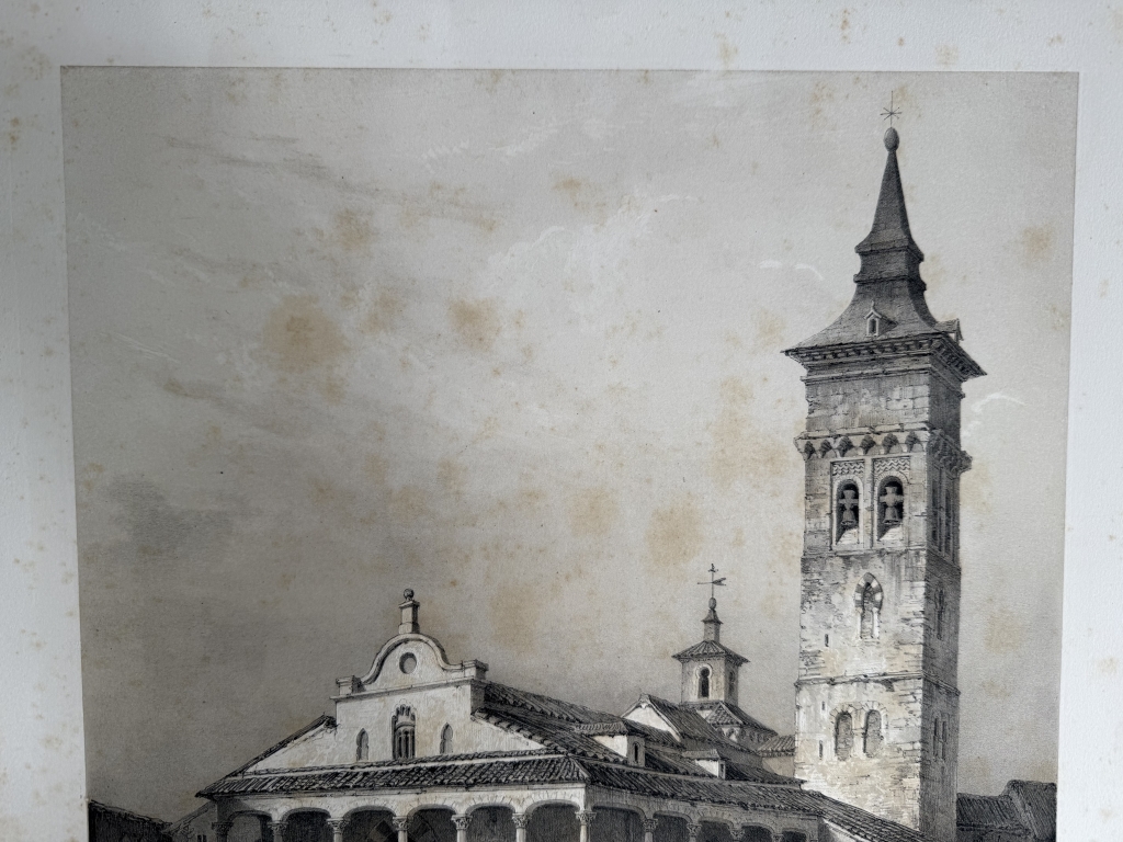 Descripción: Impresionante y muy detallada vista litográfica original de 1842 de Jenaro Pérez de Villaamil, a partir de un croquis de Carderera, de la Concatedral de Santa María la Mayor ubicada en Guadalajara, Castilla-La Mancha, (España). Varios habitantes adornan la vista. Los autores del grabado son Fichot y Bayot y fue impreso por Lemercier