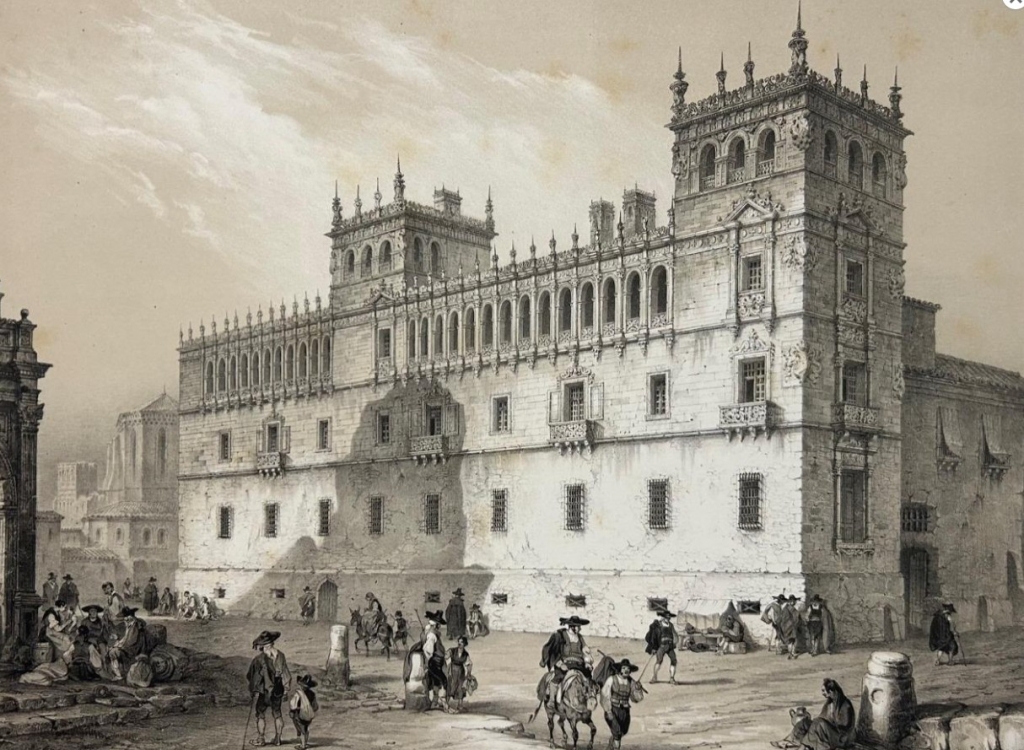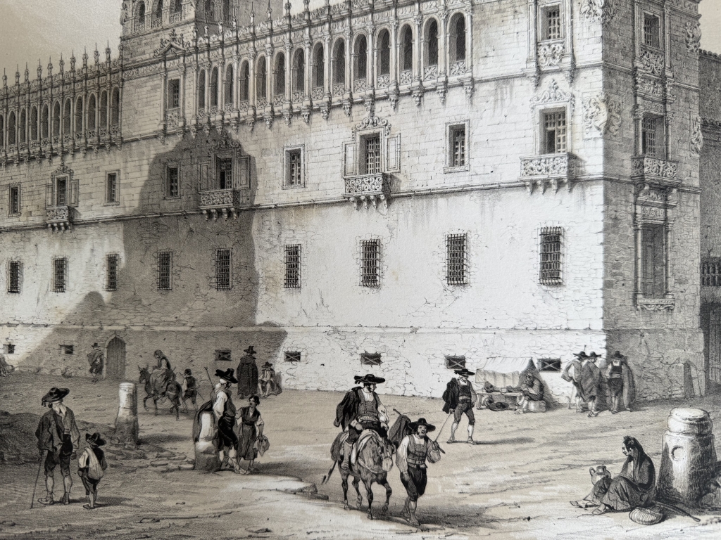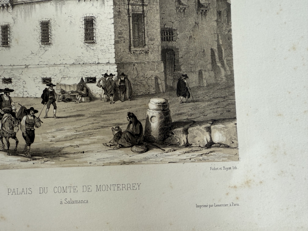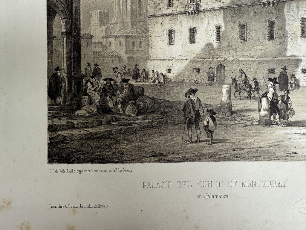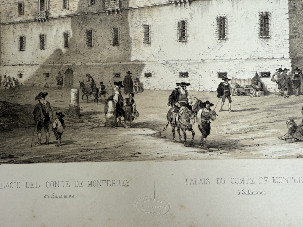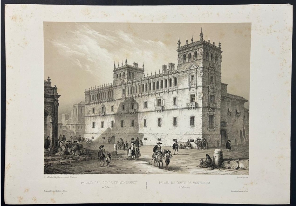 Descripción: Impresionante y muy detallada vista litográfica original de 1842 del Palacio de Monterrey, ubicado en Salamanca, Castilla-León. España, realizada por Jenaro Pérez de Villaamil, a partir de un croquis de Carderera. El palacio fue construido en 1539 por Alonso de Acevedo Zúñiga, tercer conde de Monterrey. Varios habitantes adornan la vista. Autores del grabado fueron Fichot y Bayot y fué impreso por Lemercier.