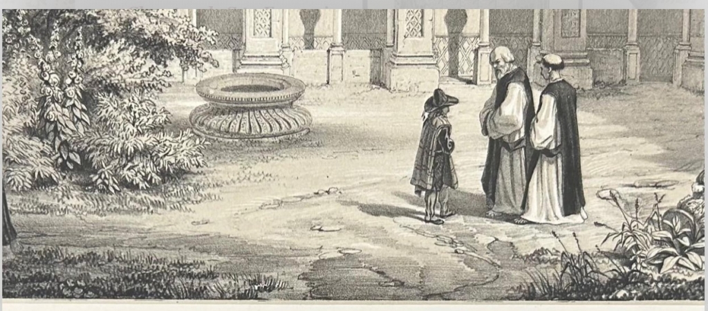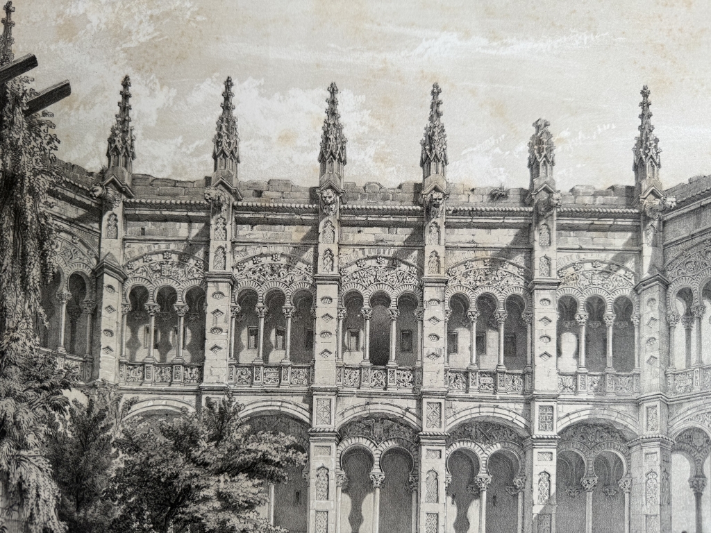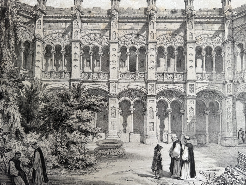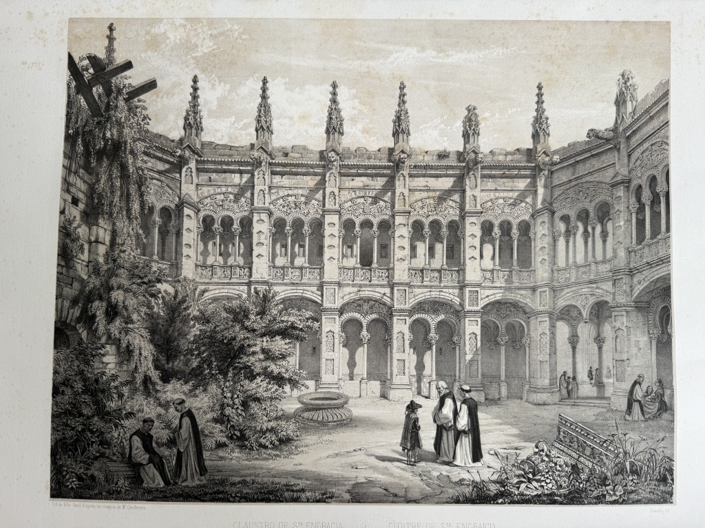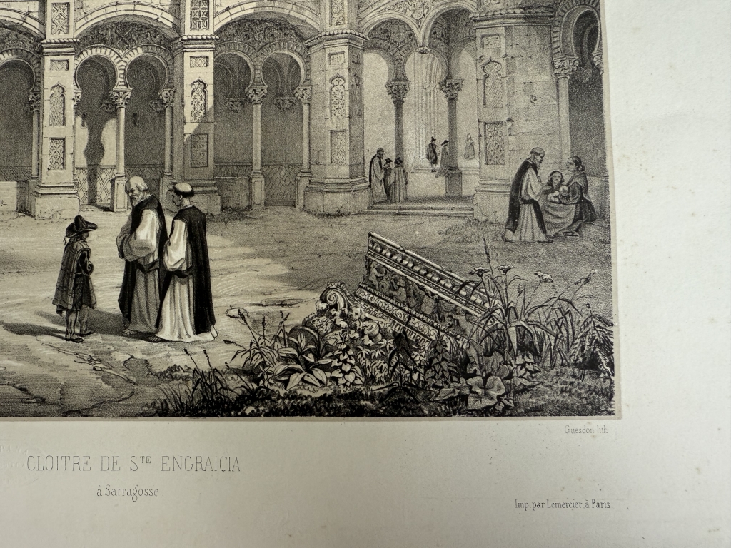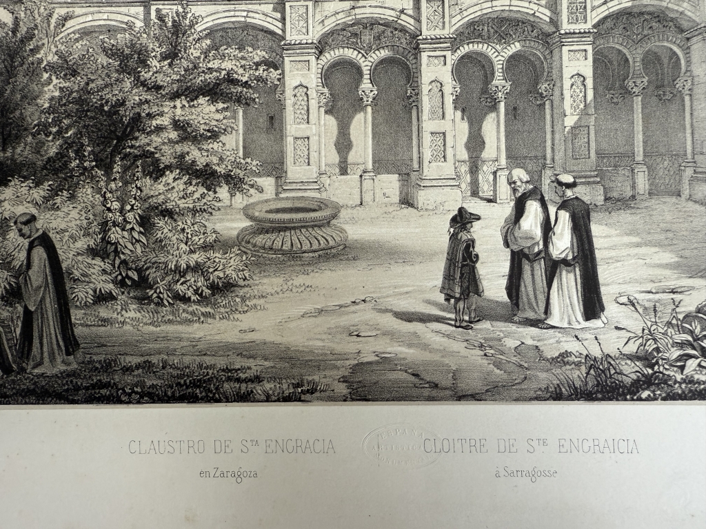 Descripción: Impresionante y muy detallada vista litográfica original de Jenaro Pérez de Villaamil ( previo croquis de Carderera), de 1842 del claustro de la iglesia de Santa Engracia de Zaragoza, España. Varios frailes adornan la vista. El autor del grabado es Guesdon y la impresión de Lemercier