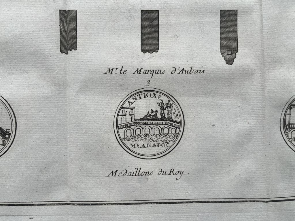 En la parte superior y central podemos ver varias vistas del famoso puente romano de Ambroix, en el sur de Fancia. En la primera panorámica se nos muestra la vista de localización del punte, luego un detalle del mis y a continuación, una panorámica de su arcos y sus pilares. Luego poseemos tres representaciones de puentes romanos, que corresponden a los que nos muestran tres medallones o monedas de la colección real de esa época.