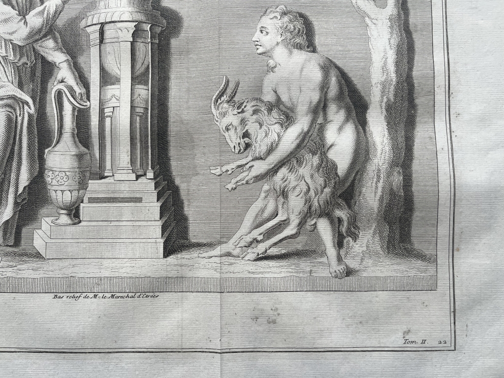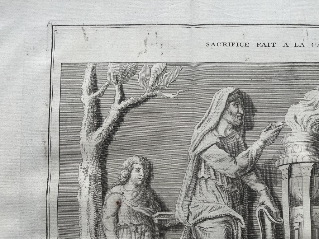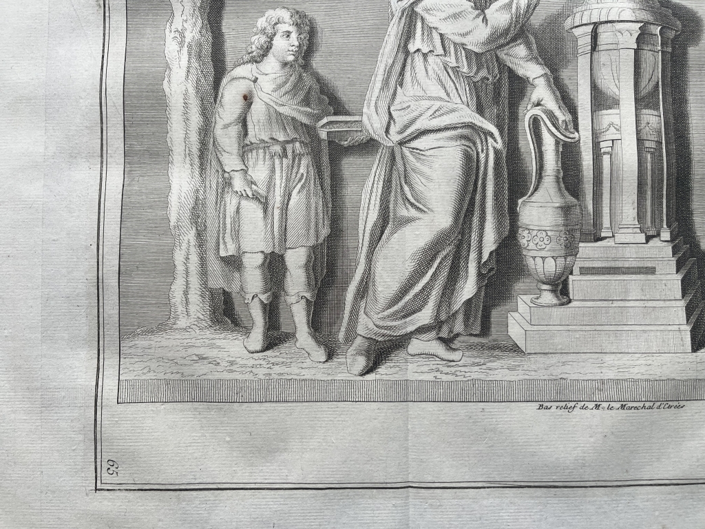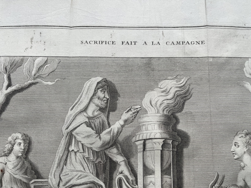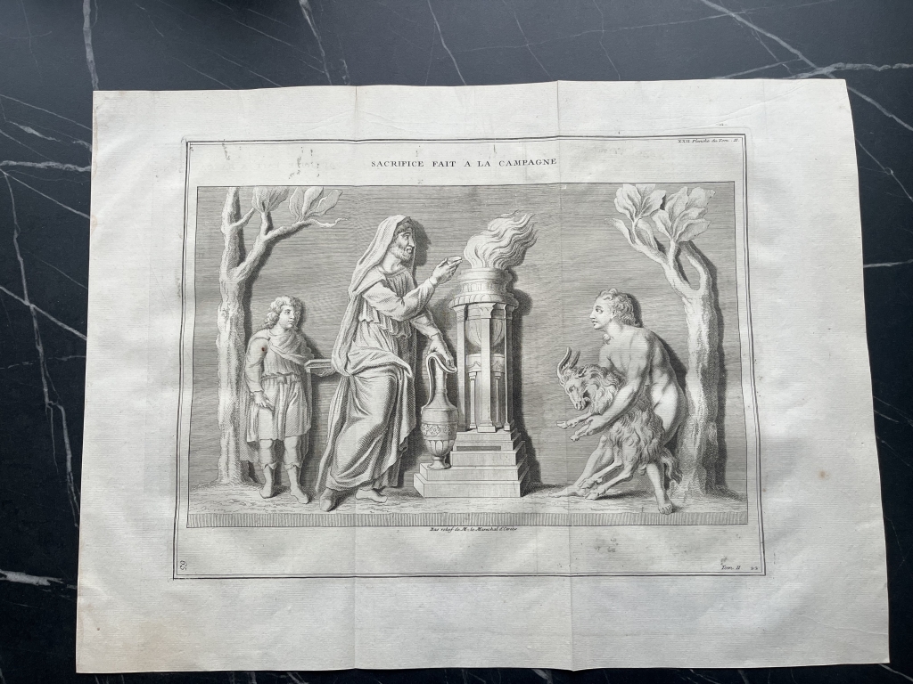Se nos muestra en este grabado de gran formato, correspondiente a una bajorrelieve que se puede observar en una colección privada romana, que lleva por título "Sacrifice fait a la Campagne”, como bien dice su enunciado un sacrificio que se lleva a cabo en el campo, en el que vemos a tres personajes participando en el mismo, con una ara romana en el centro y un animal al que van a sacrificar al dios romano correspondiente. Podemos ver con detalle el rito y las vestimentas de los participantes, así un pormenor del altar de sacrificio.
