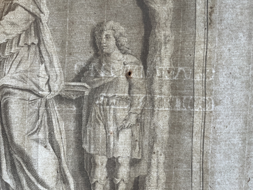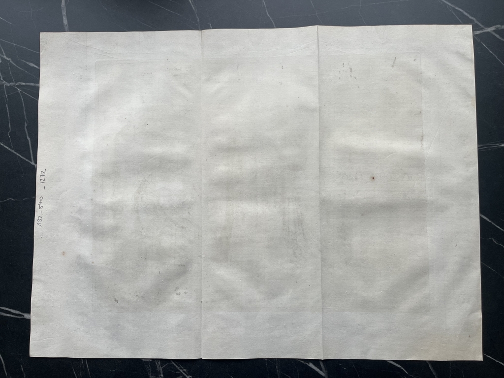 Su estado con conservación es bueno, con fuerte y oscura impresión, en papel verjurado con marca de agua (serie de letras), con dos pliegue originales y amplios márgenes blancos. Ver fotografías.