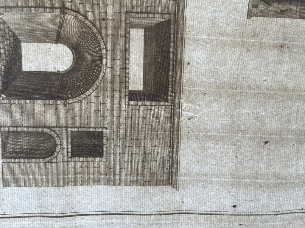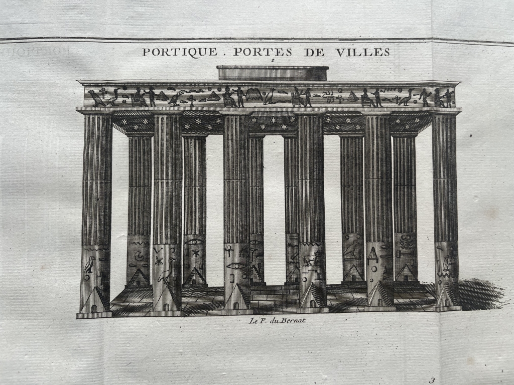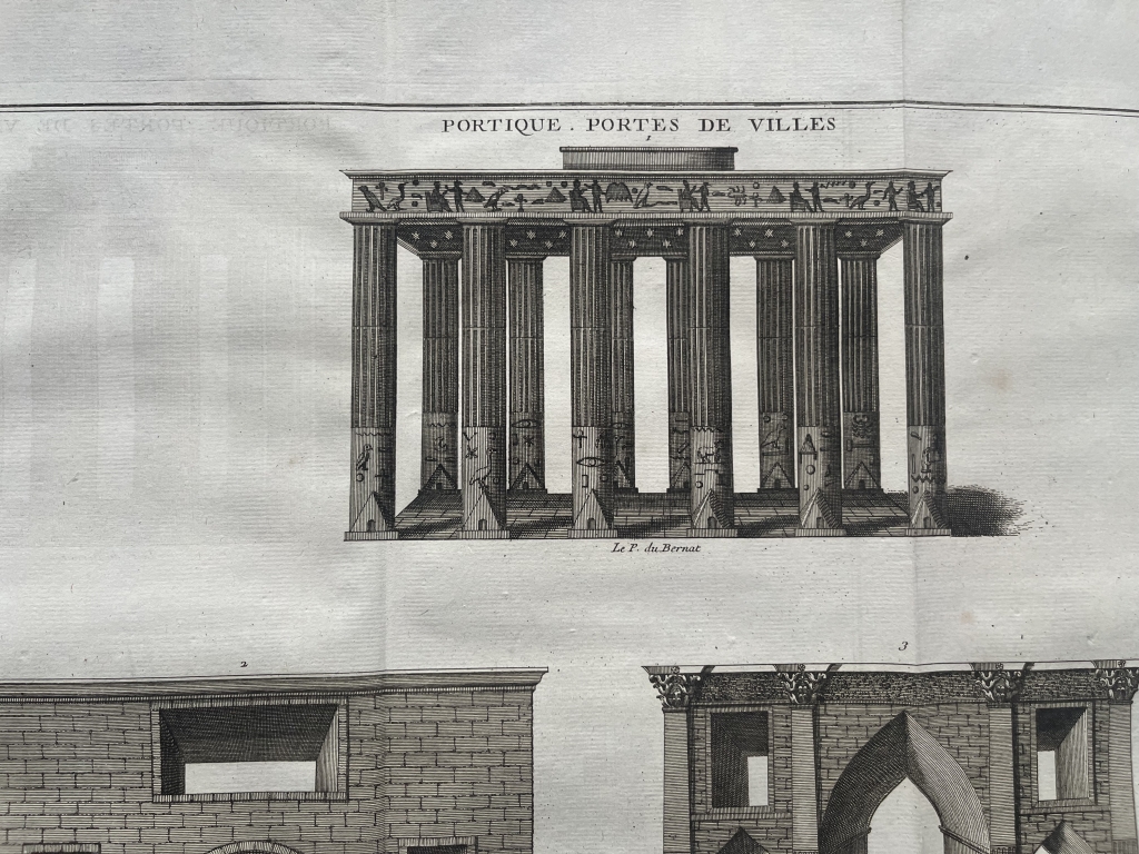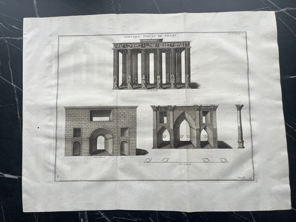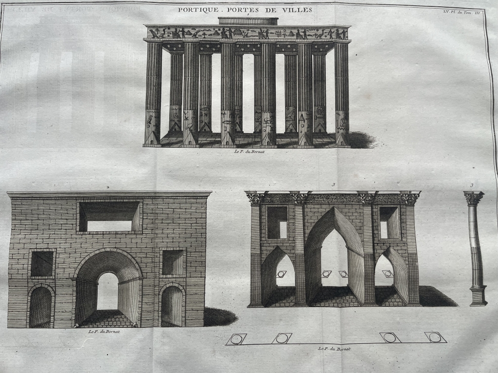 Se nos muestra en este grabado de gran formato, que lleva por título “Portique, Portes de Villes”, como bien dice su enunciado, tres modelos de entradas a la ciudad romana, con todo lujo de detalle, destacando su monumentalidad.