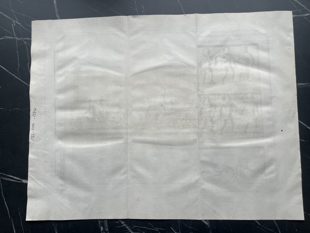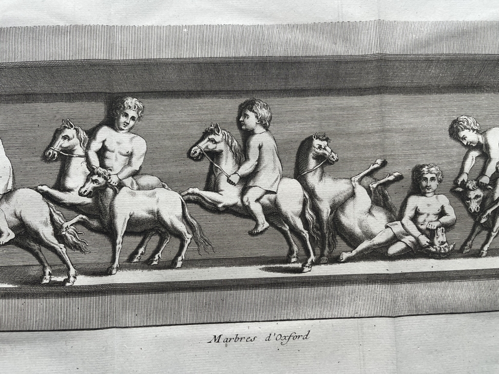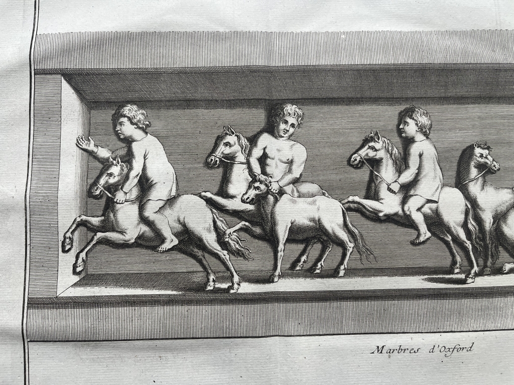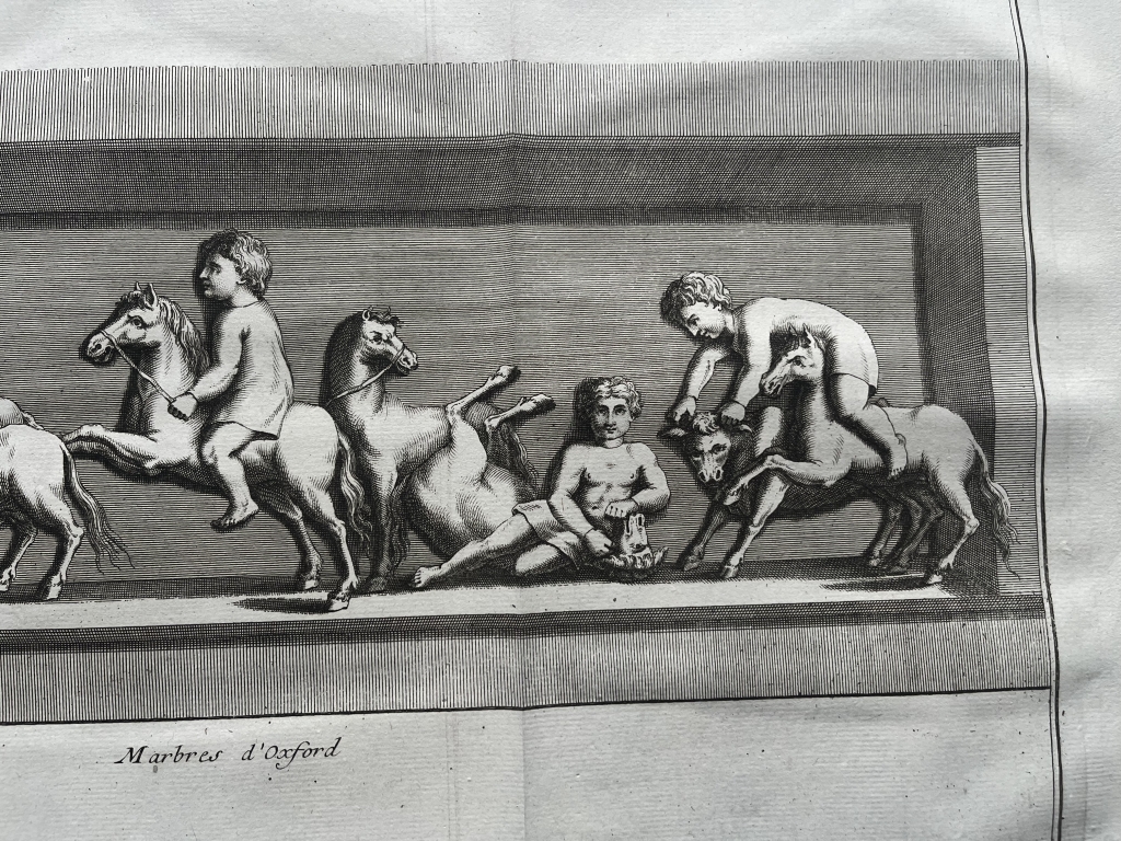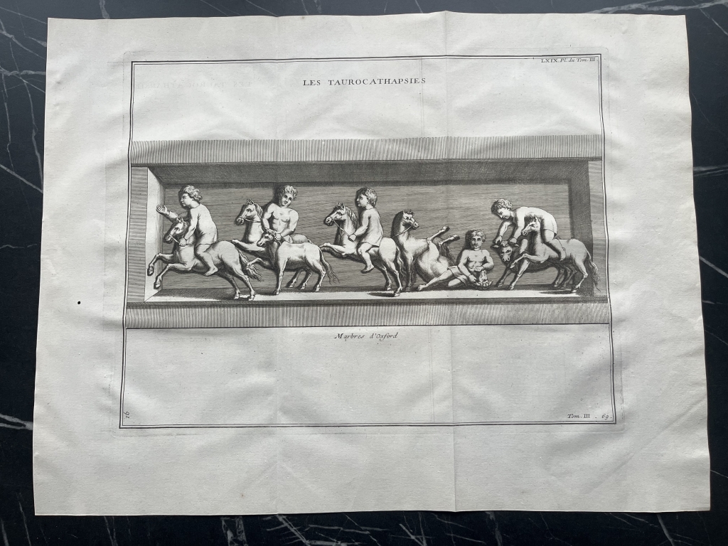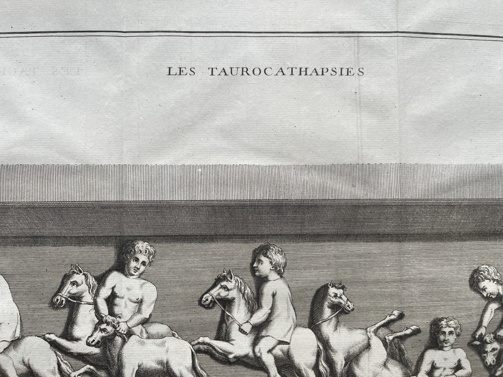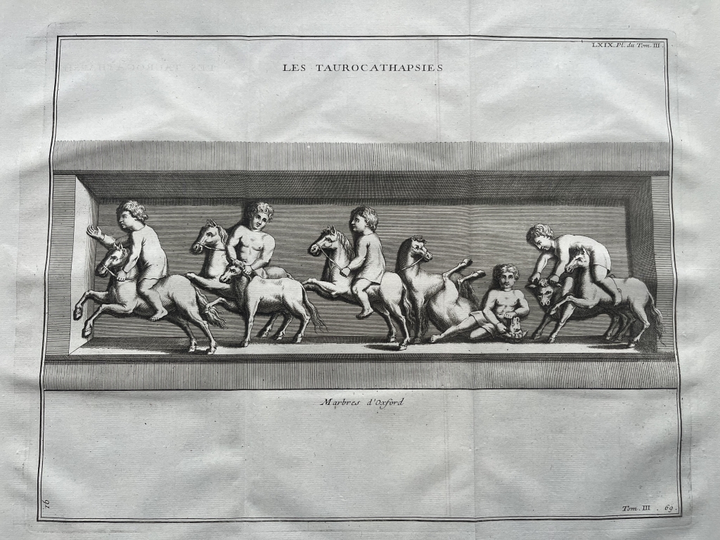 Se nos muestra en este grabado de gran formato, que lleva por título “"Les Taurocathapsies”, como bien dice su enunciado, varios personajes mitológicos en caballo montando y cazando toros, en lo que en la antigüedad se denominó “tauromaquia”, asocia a deidades. Son numerosos detalles los que nos muestra, este precioso relieve, pertenecientes a los denominados “mármoles de Oxford”