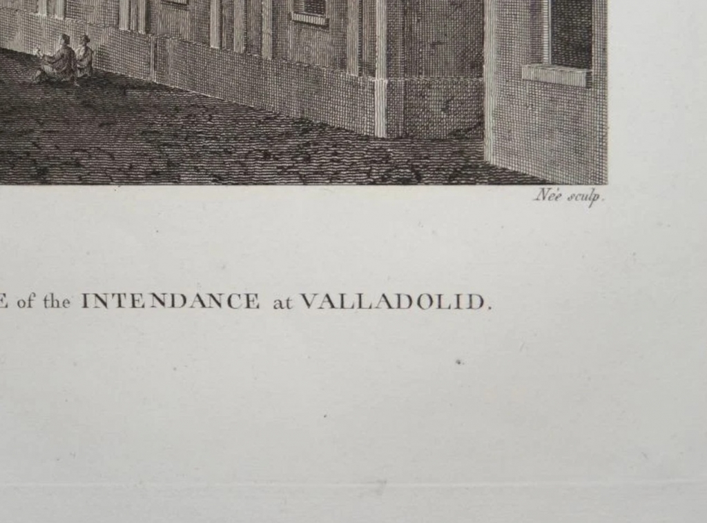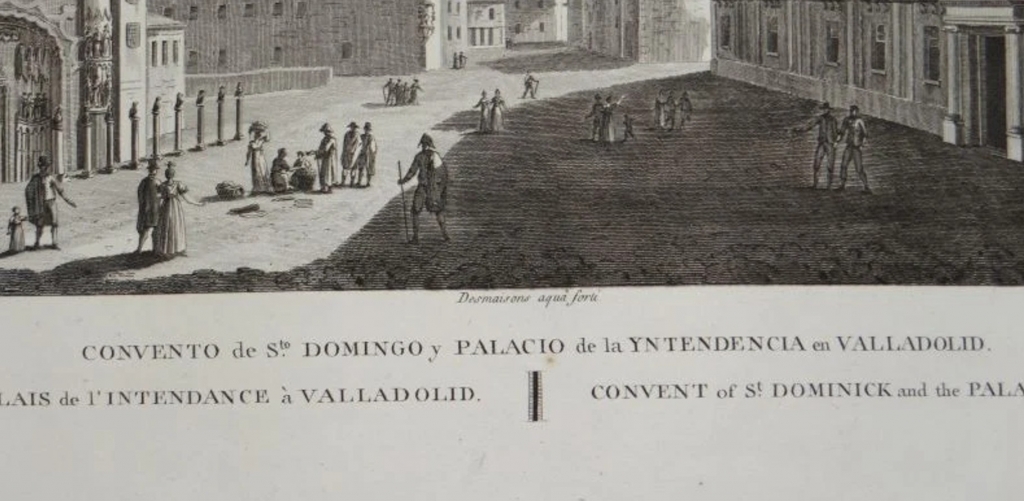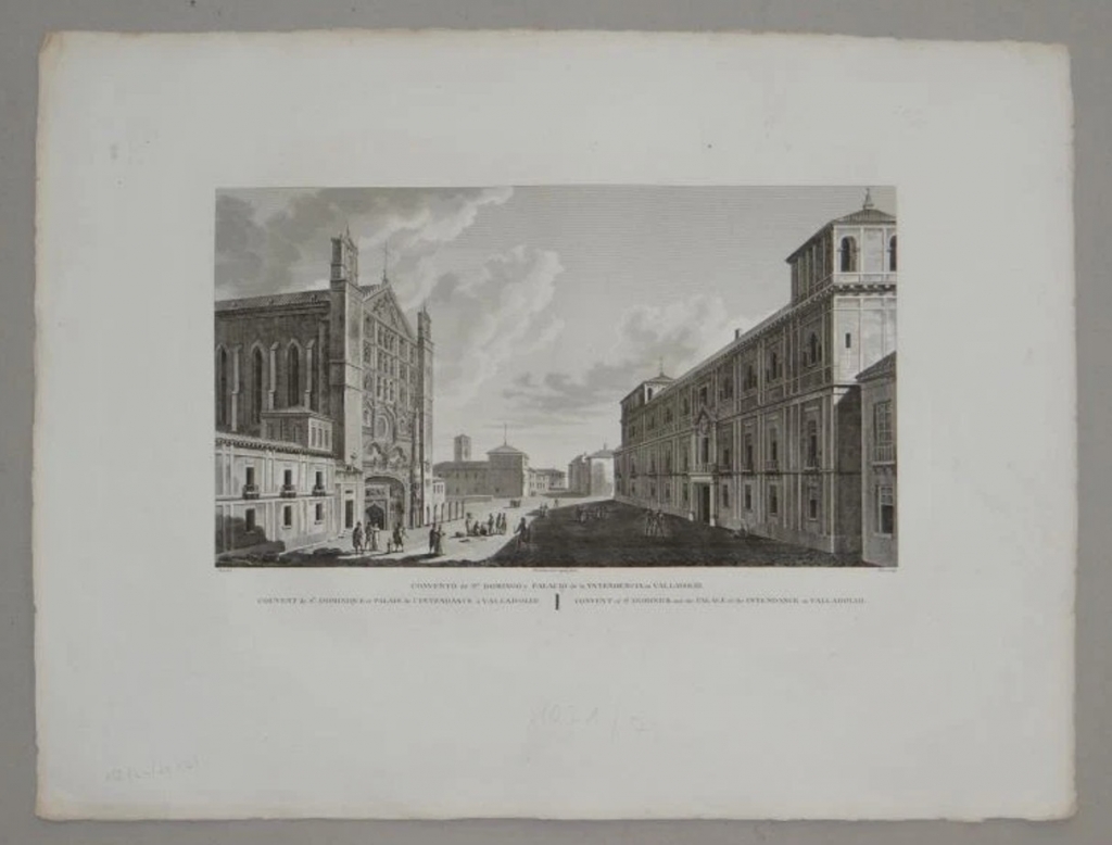 Este grabado, de gran formato, original, titulado, "Convento de Sto. Domingo y Palacio de la Yntendencia en Valladolid", nos muestra como su título indica, el convento de santo Domingo y en antiguo palacio de la Intendencia, en la ciudad castellana de Valladolid (España). El título viene en tres idiomas:español, inglés y francés.