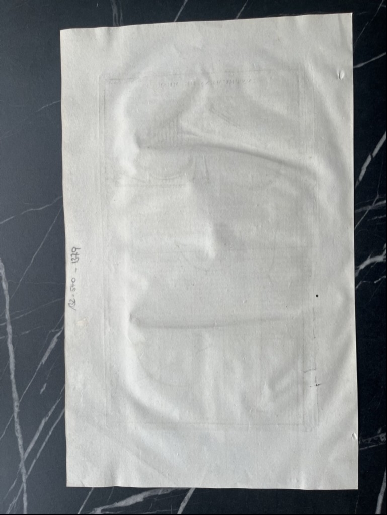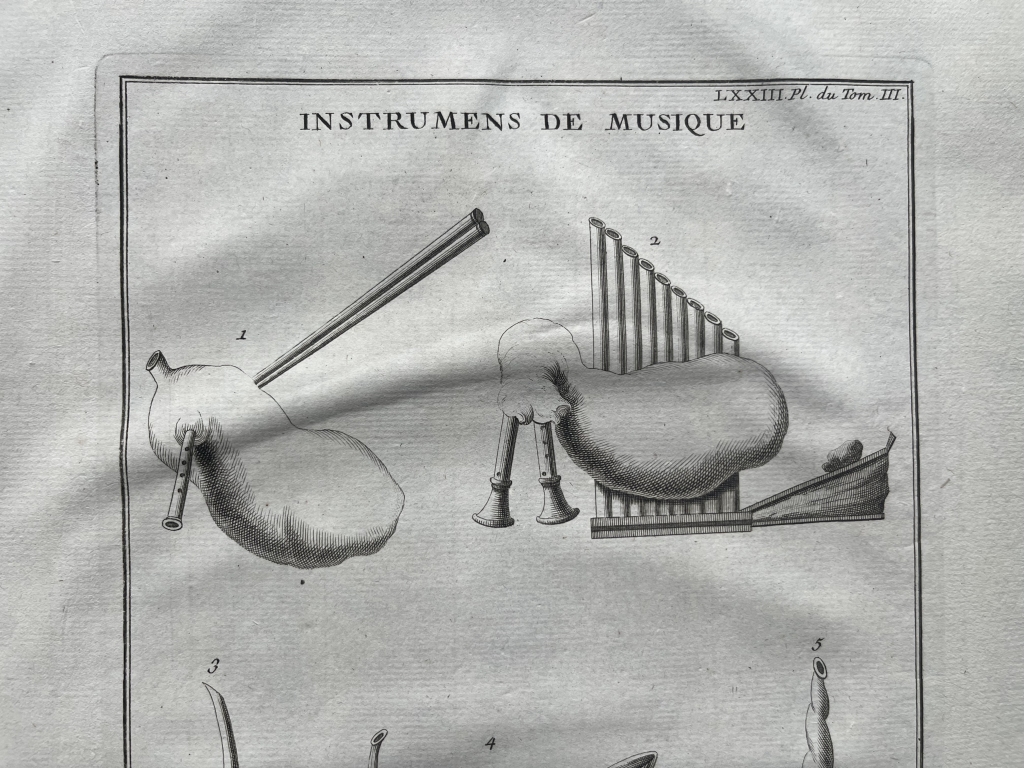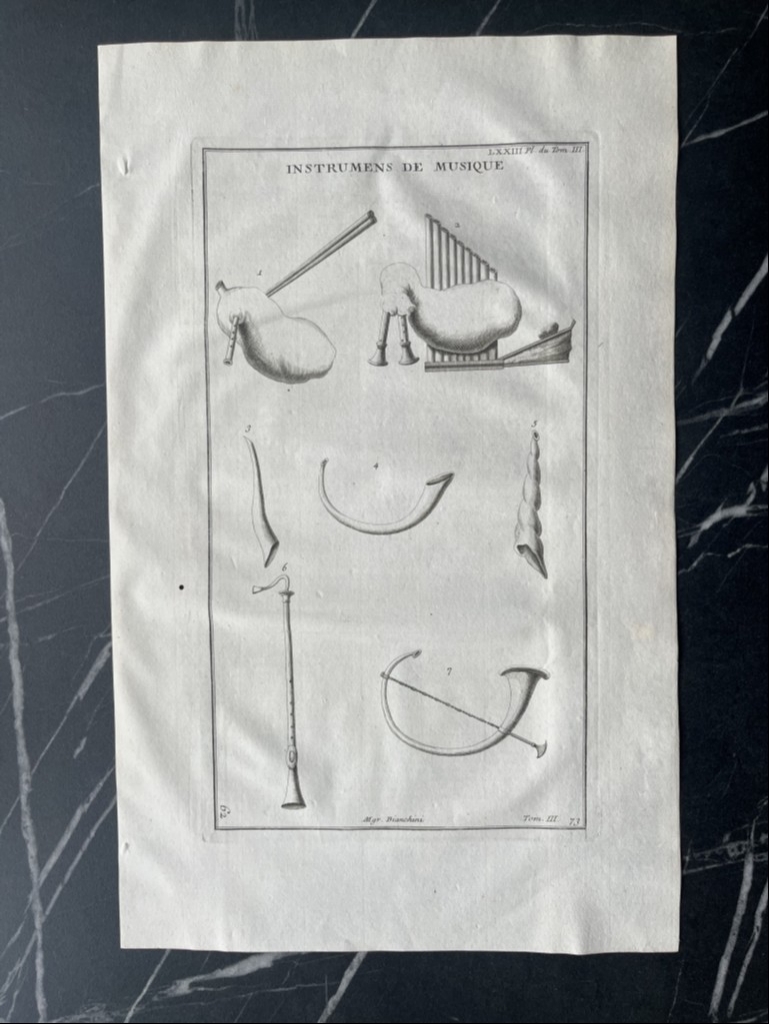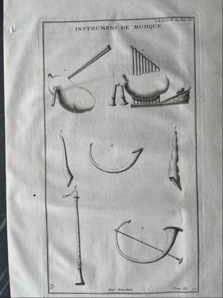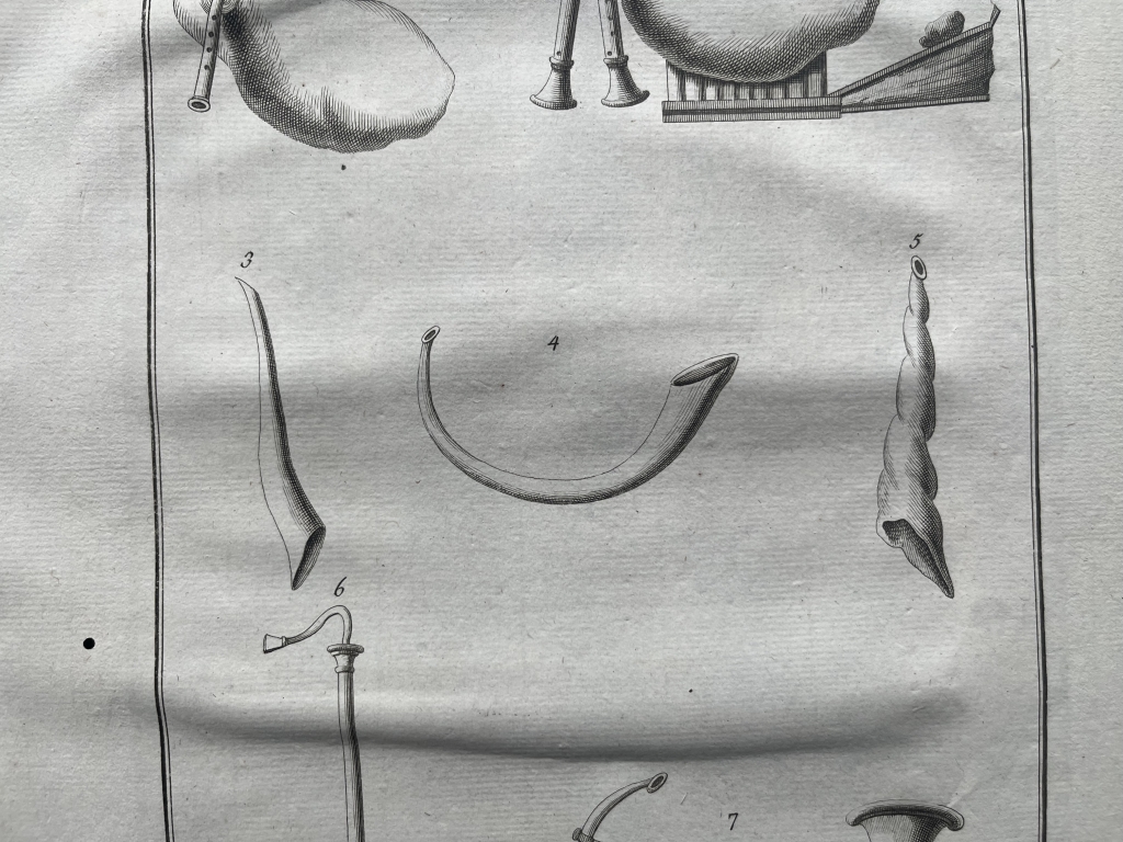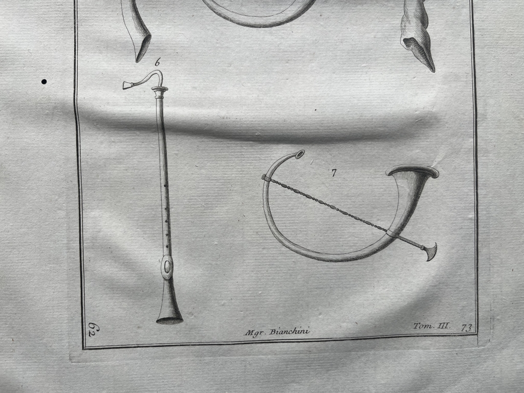 Se nos muestra en este grabado a toda página, que lleva por título “Instrumens du musique”, en la que podemos apreciar con todo lujo de detalle, siete instrumentos de música utilizados en la antigua Roma y que podemos conocer por documentación escrita y por hallazgos arqueológicos de los mismos o su representación en diferentes manifestaciones de su arte, como mosaicos, pintura, escultura,.. Aquí en concreto se trata de los que se conocen por instrumentos de viento, que básicamente produce sonido al soplar por ellos. Se puede observar la diferente tipología de los mismos y por ello, producían diferentes tipos de sonidos musicales. En la antigua romana, cada uino de ellos, era conocido con un nombre diferente, como es lógico.