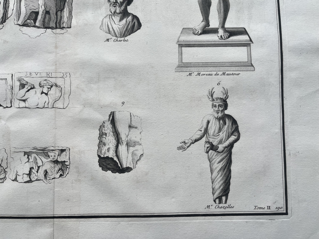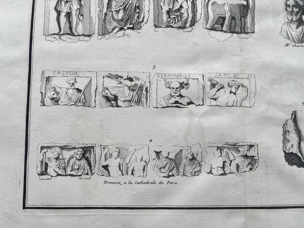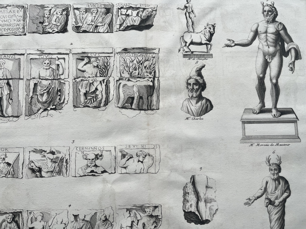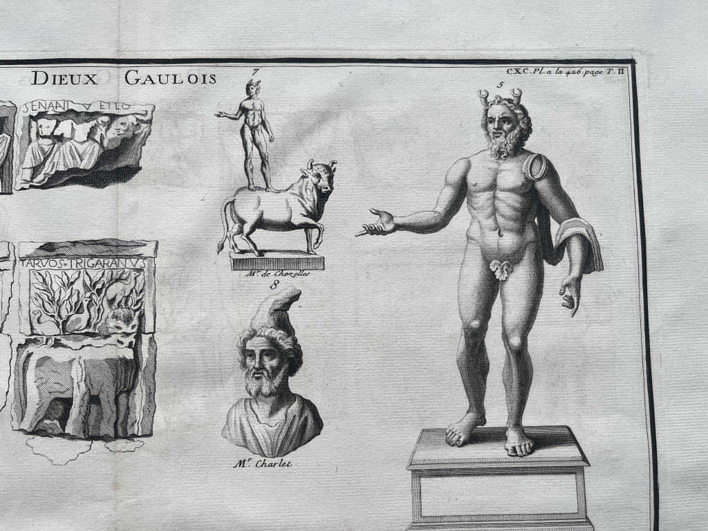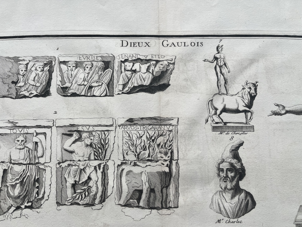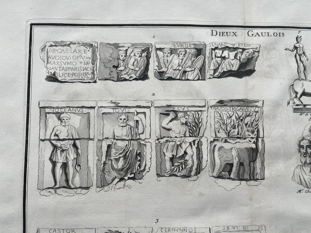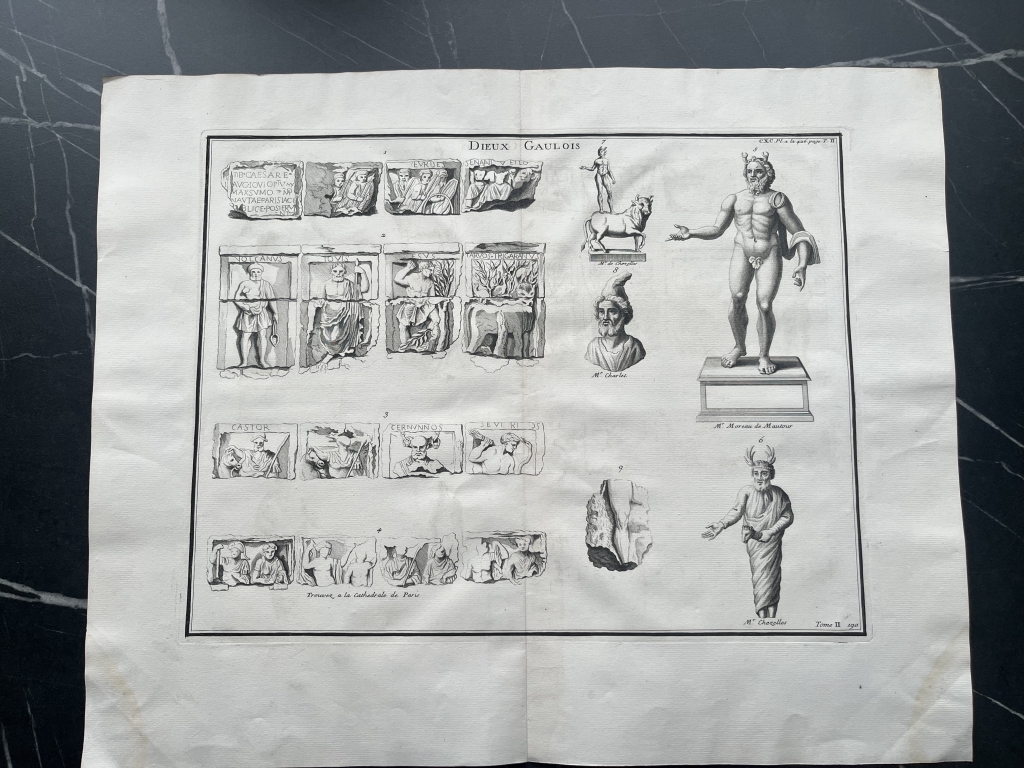 Se nos muestra en este grabado de gran formato, a doble página, que lleva por breve título “Dieux galois”, en el que podemos apreciar en que se nos presentan diferentes representaciones de los dioses de la Galia ( la antigua Francia, en época romana), procedentes de relieves y esculturas exentas, en los que podemos apreciar su forma y su nombre, en algunos casos.