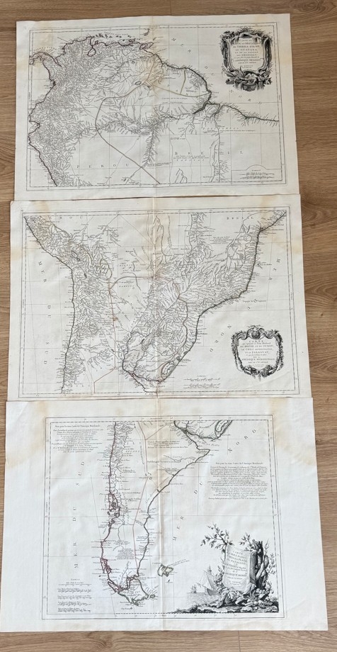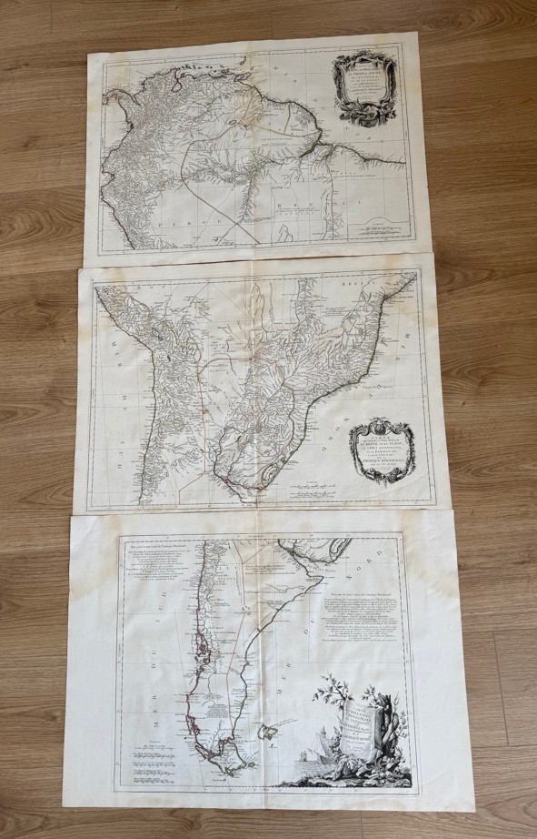 Se tratan de tres hojas independientes (pero cada una con su bella cartela barroca de título que nos muestran toda América del sur. Mapa grabado en placa de cobre, publicado en 1779, realizado por el geógrafo y cartógrafo francés Sr. Anville, siendo su editor el famoso italiano Paolo Santini y Remondini. El conjunto hace un extraordinario mural o mapa de pared de América del sil en la segunda mitad del siglo XVIII.
