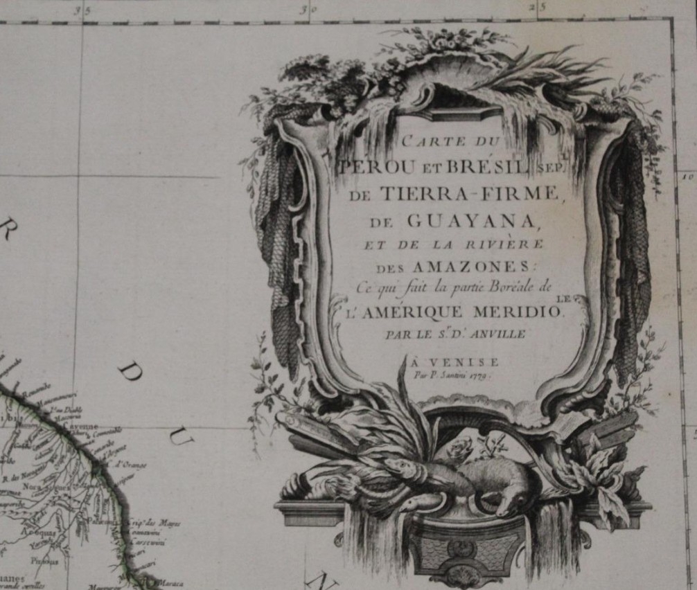 - Carte du Perou et Bresil sep.l de Tierra-Firme, de Guayana, et de le Riviere des Amazones: Ce qui fai la partie Boréale de l'Amérique Méridio.le Par le Sr. D'Anville A Venice Par P. Santini 1779 Chez Remondini.