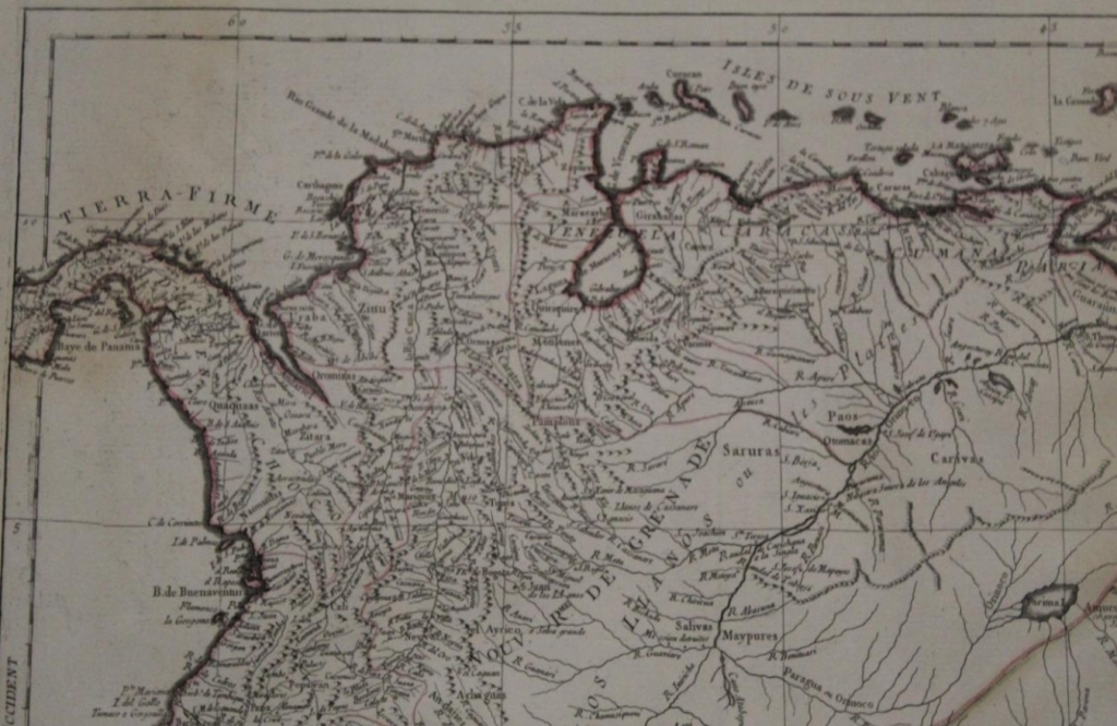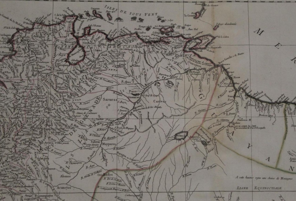 Primera hoja Este llamativo y detallado mapa de doble página grabado en cobre de la sección norte de Sudamérica se basa en el importante mapa de tres hojas del continente de D'Anville. Cubre el continente al norte del ecuador y ofrece una vista particularmente detallada de los ríos. Grandes regiones están completamente en blanco, con anotaciones sobre las distintas tribus indígenas. Esta edición fue publicada por Remondini.