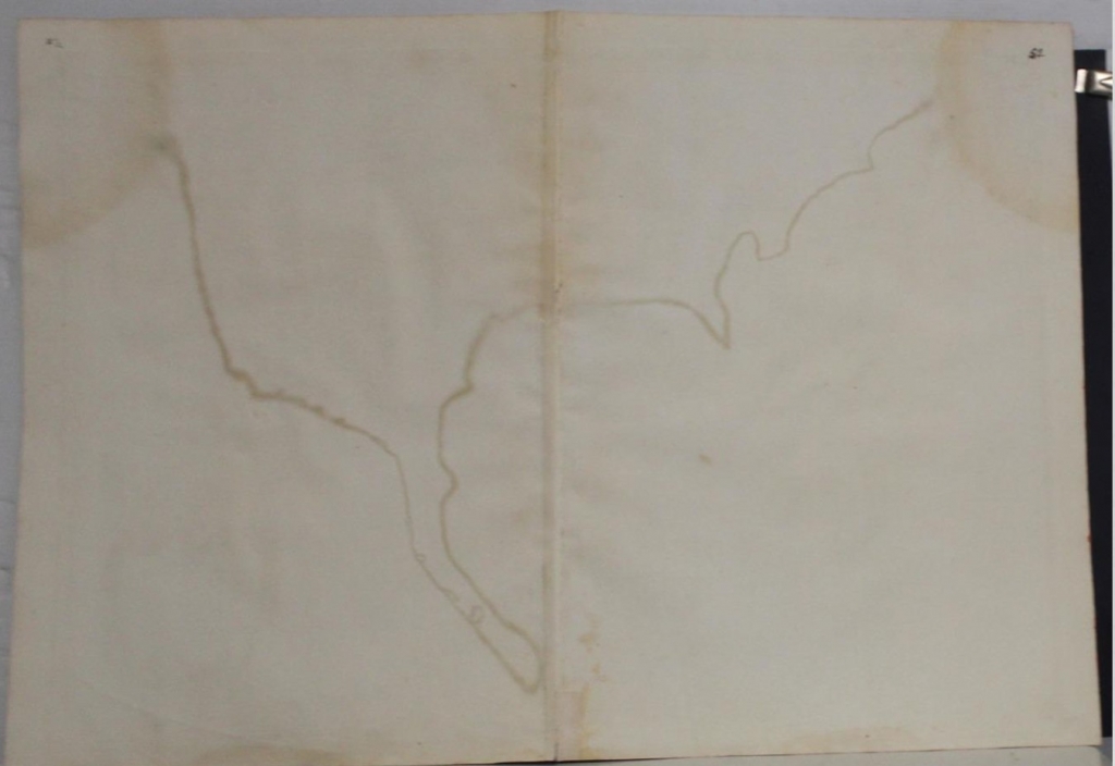 Estado: Impresión muy fuerte y oscura sobre papel muy resistente. Papel con cadenas y marcas de alambre. Las tres hojas tienen una bella marca de agua, tipo heráldico Colores originales en los contornos e interior. Márgenes amplios. Pequeñas manchas de color marrón y leves de humedad en algunos márgenes. . Mapa plegado tal como se emitió, por eso en su parte central posee un pliegue original. Las condiciones son como se puede ver en las imágenes.